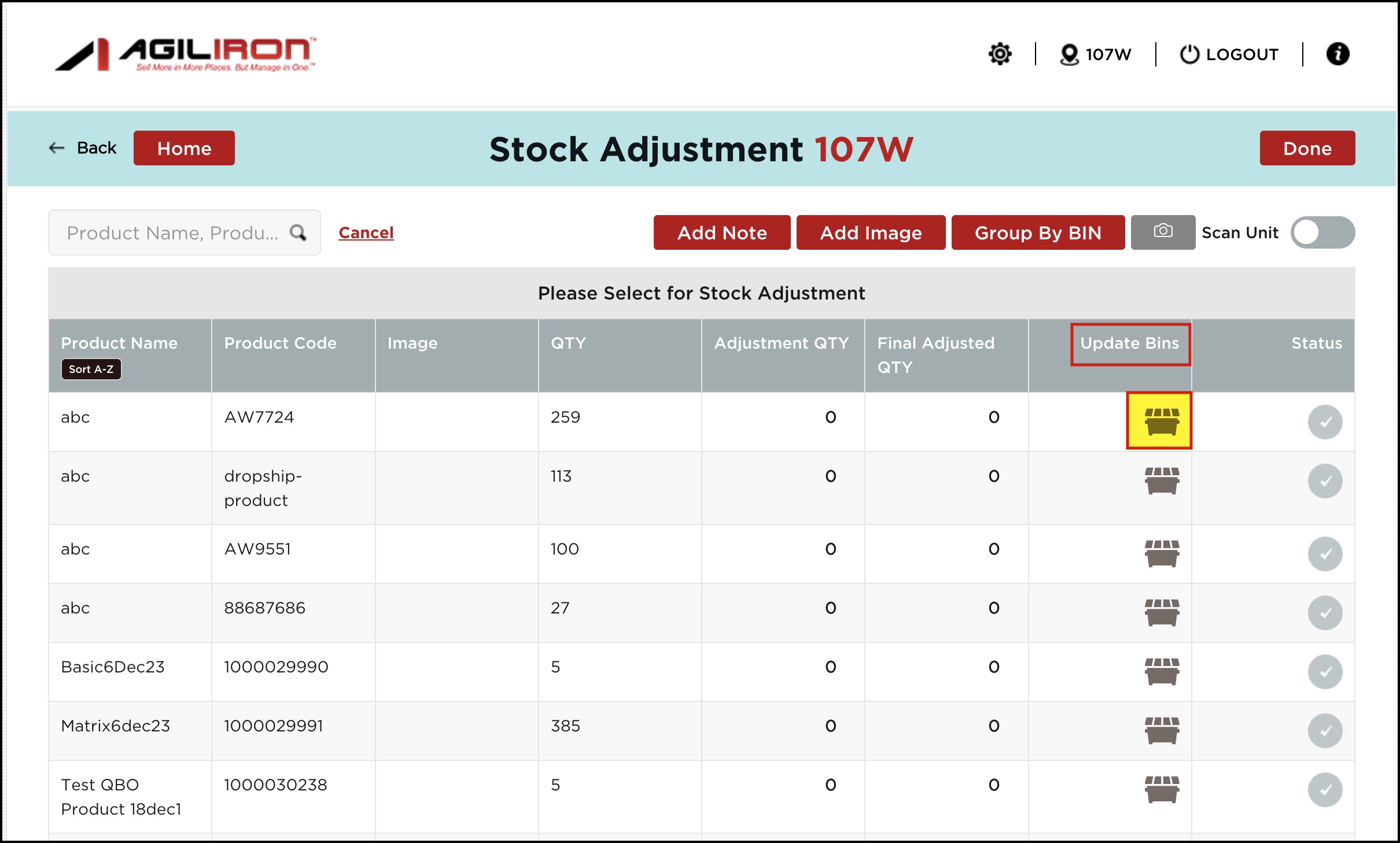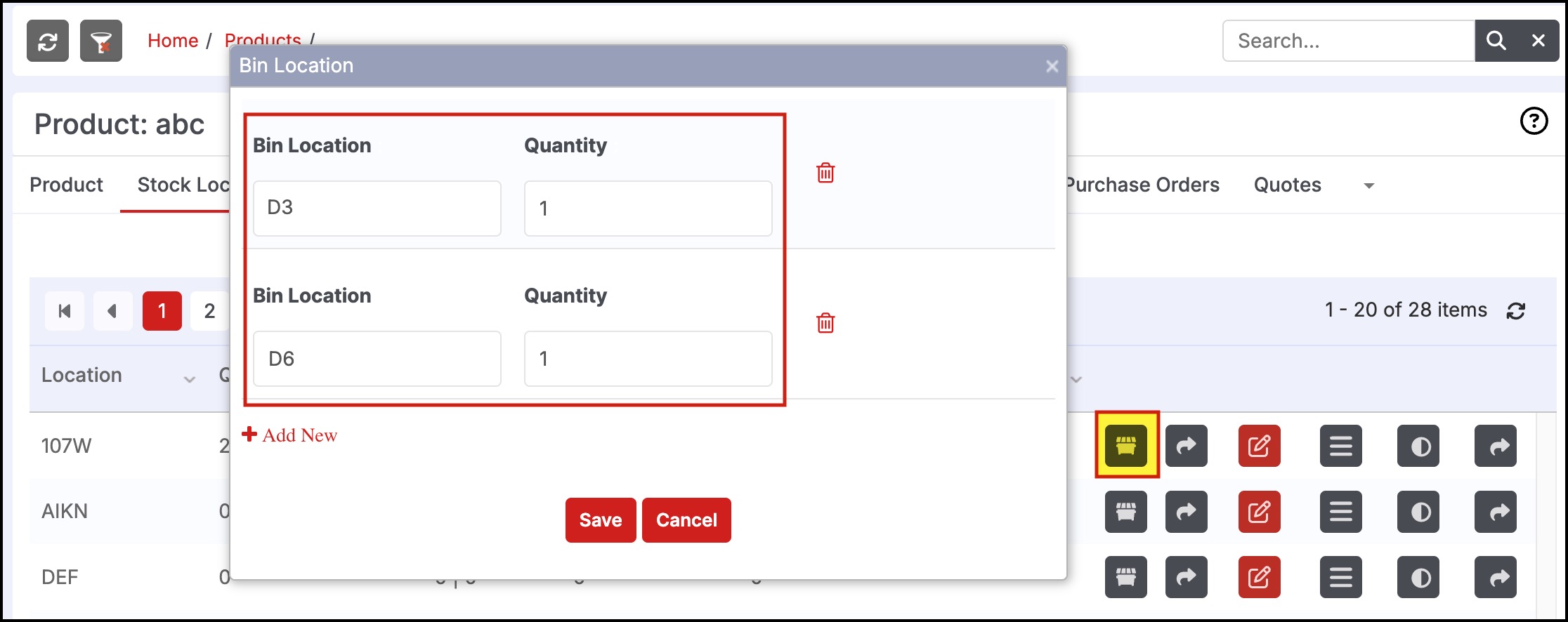 - For each product, you can add a bin location or multiple bins by clicking on the bin icon.