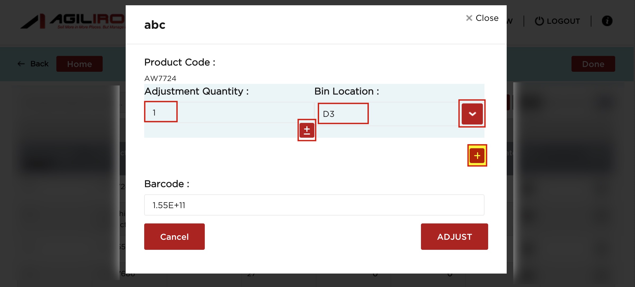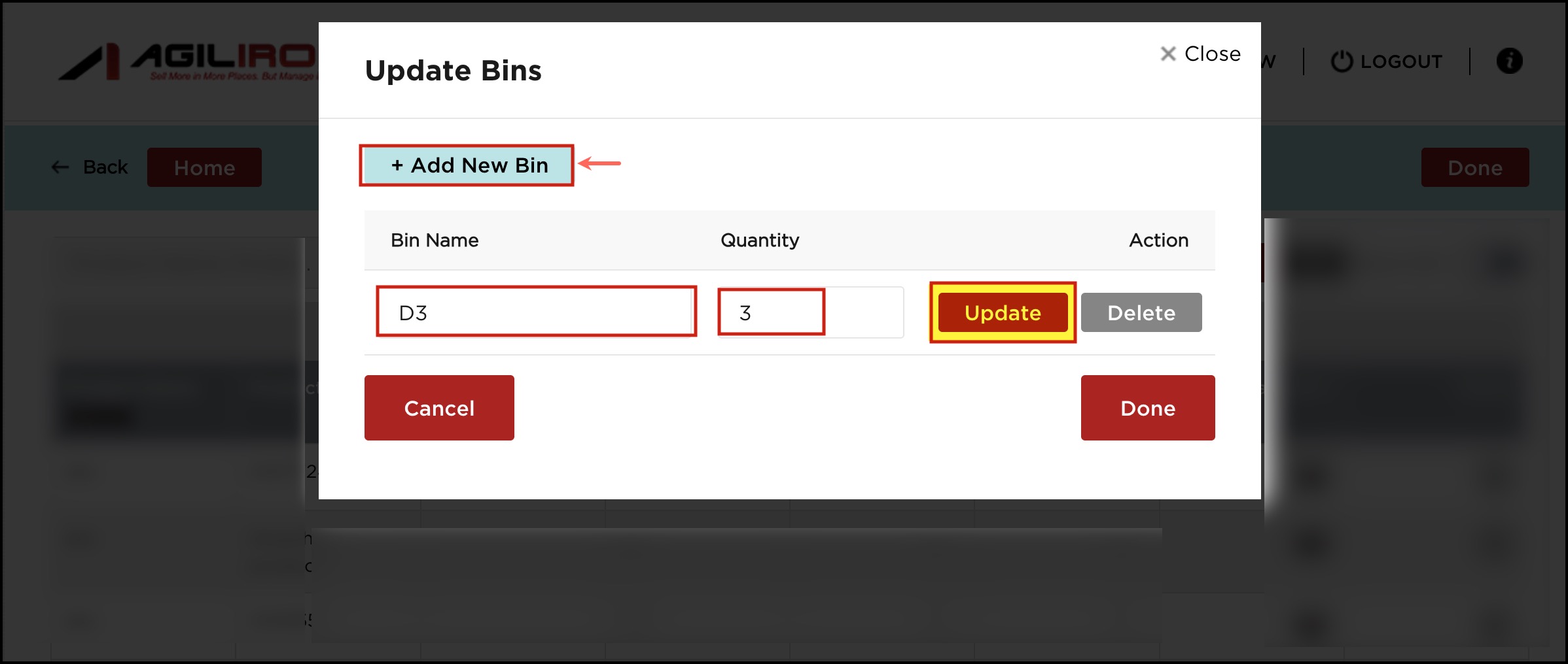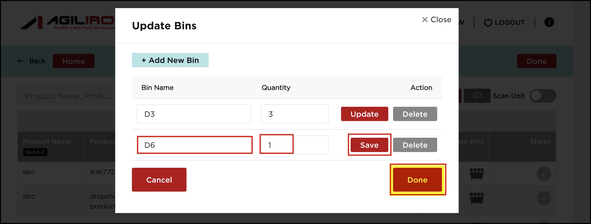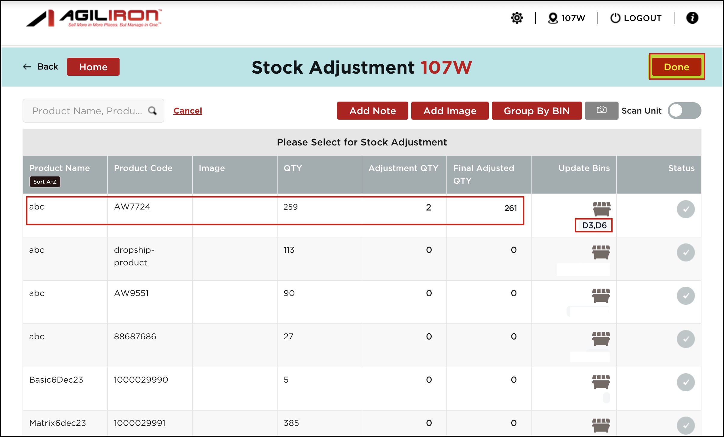 - You'll see the adjusted quantity with the bin names added. Click on Done.