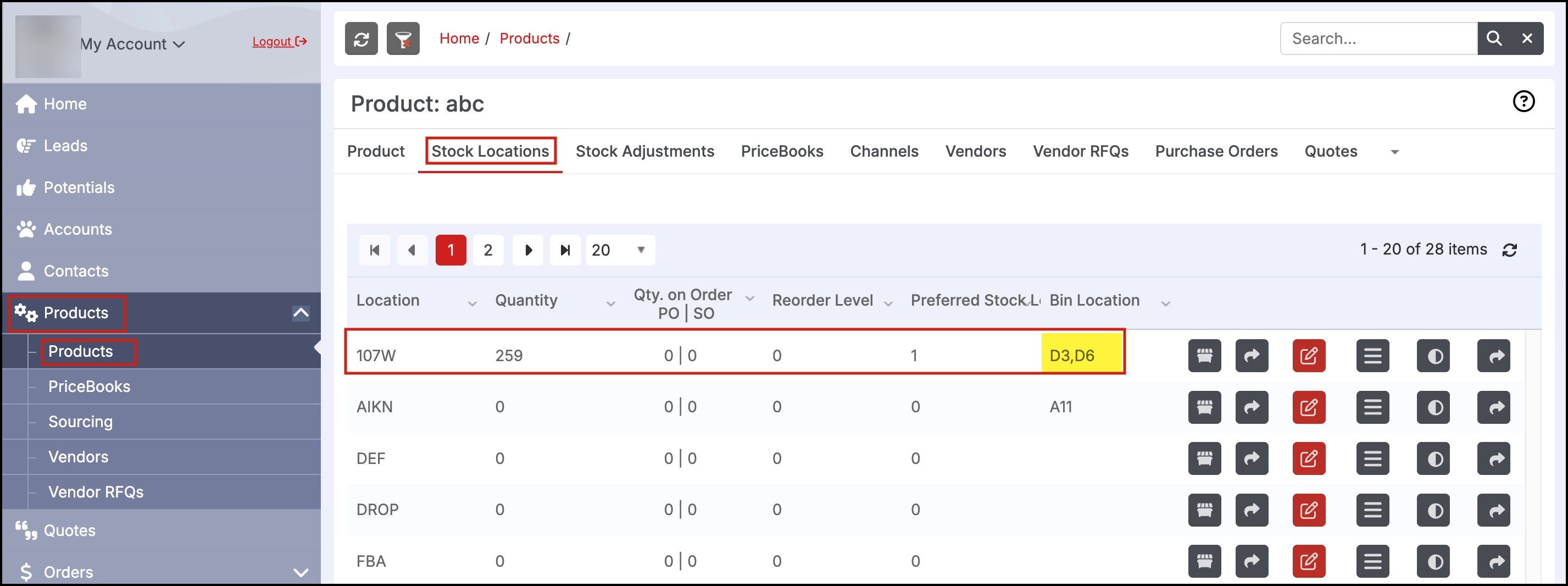 Now, in the back office, when you go to Products -> that particular product -> switch to the Stock Locations tab, you can see the newly added bin locations: D3 and D6.