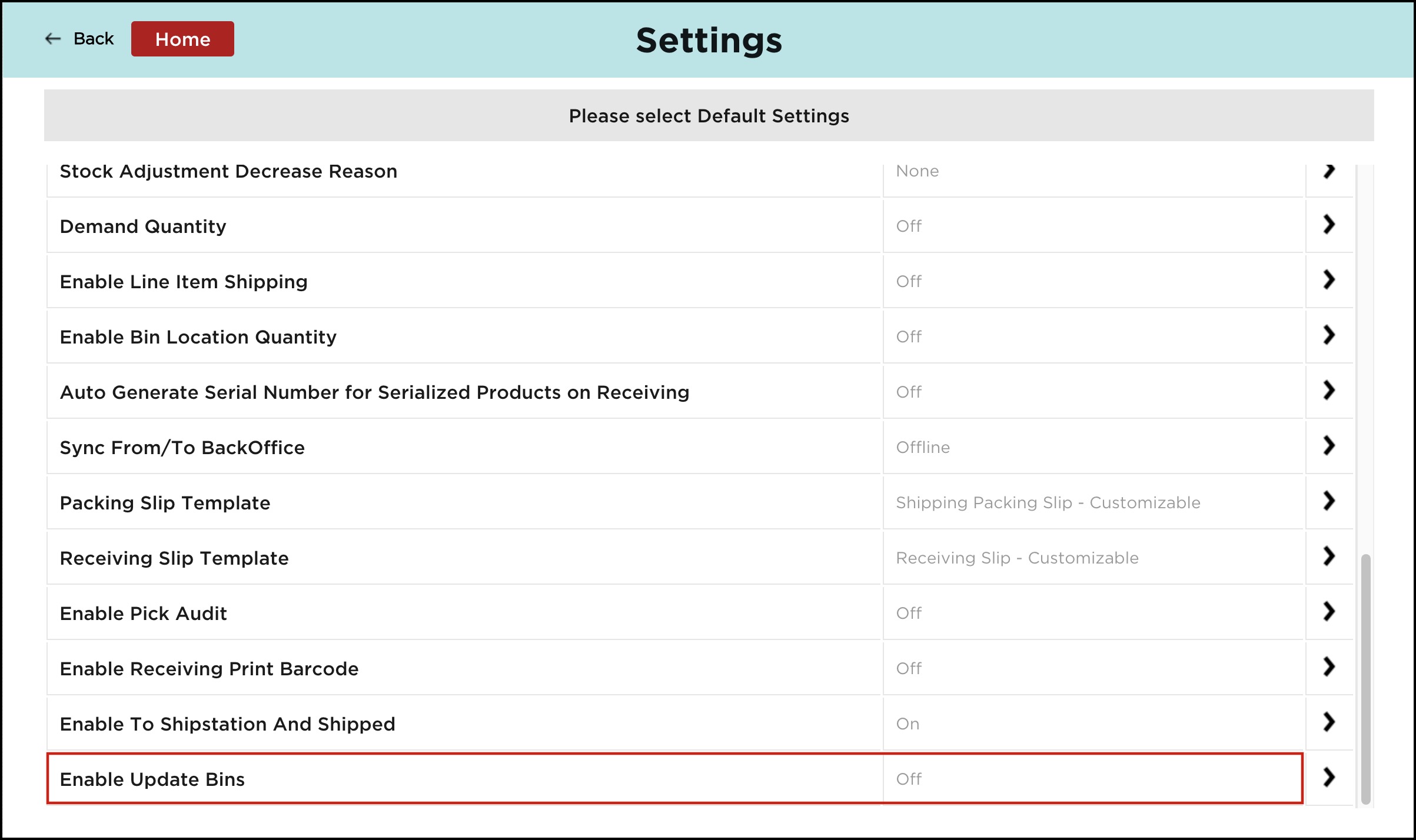 To enable Update Bins, go to Warehouse App Settings and set Enable Update Bins to On.