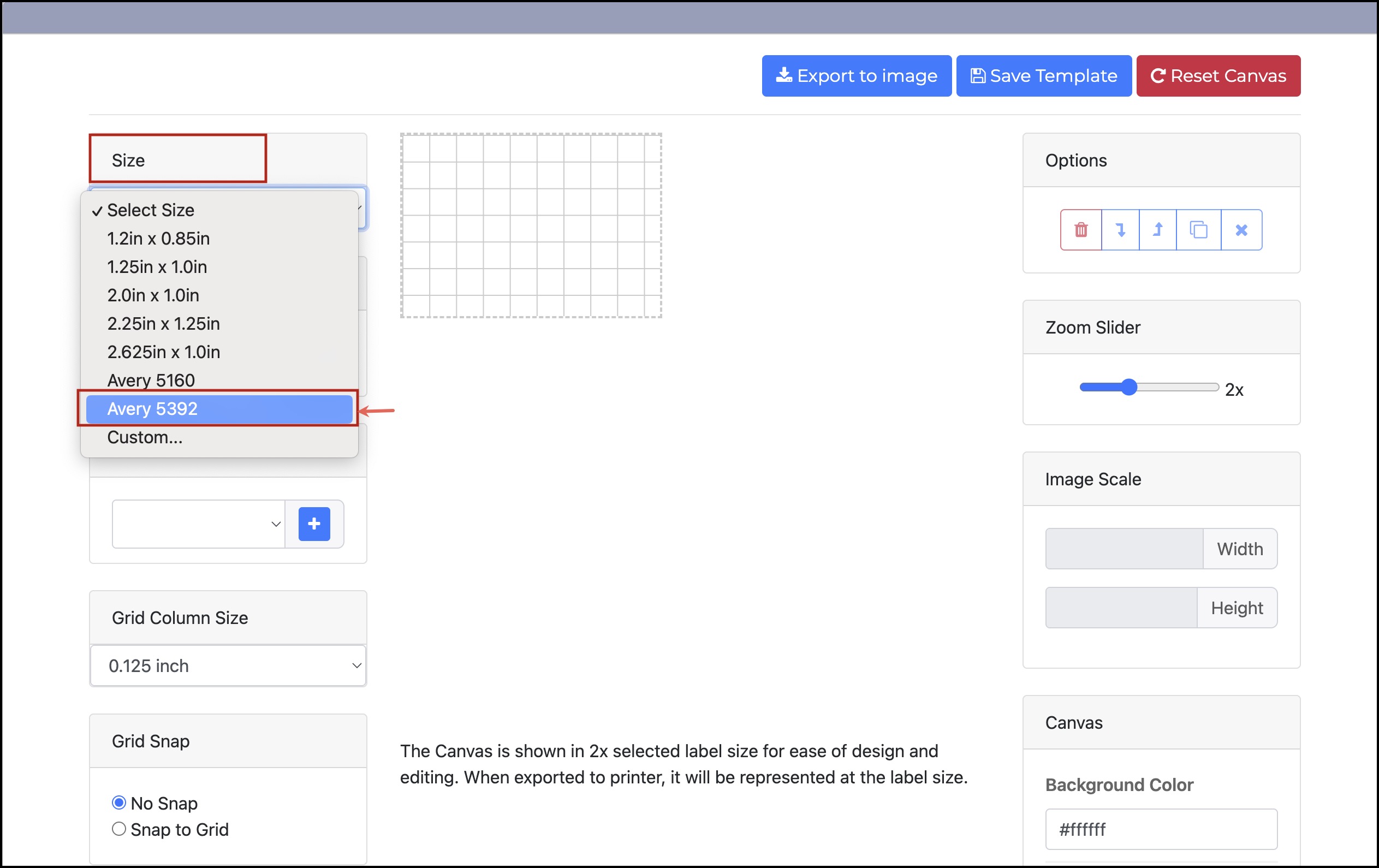 - A pop-up window will open, click on the Size drop-down and select Avery 5392.