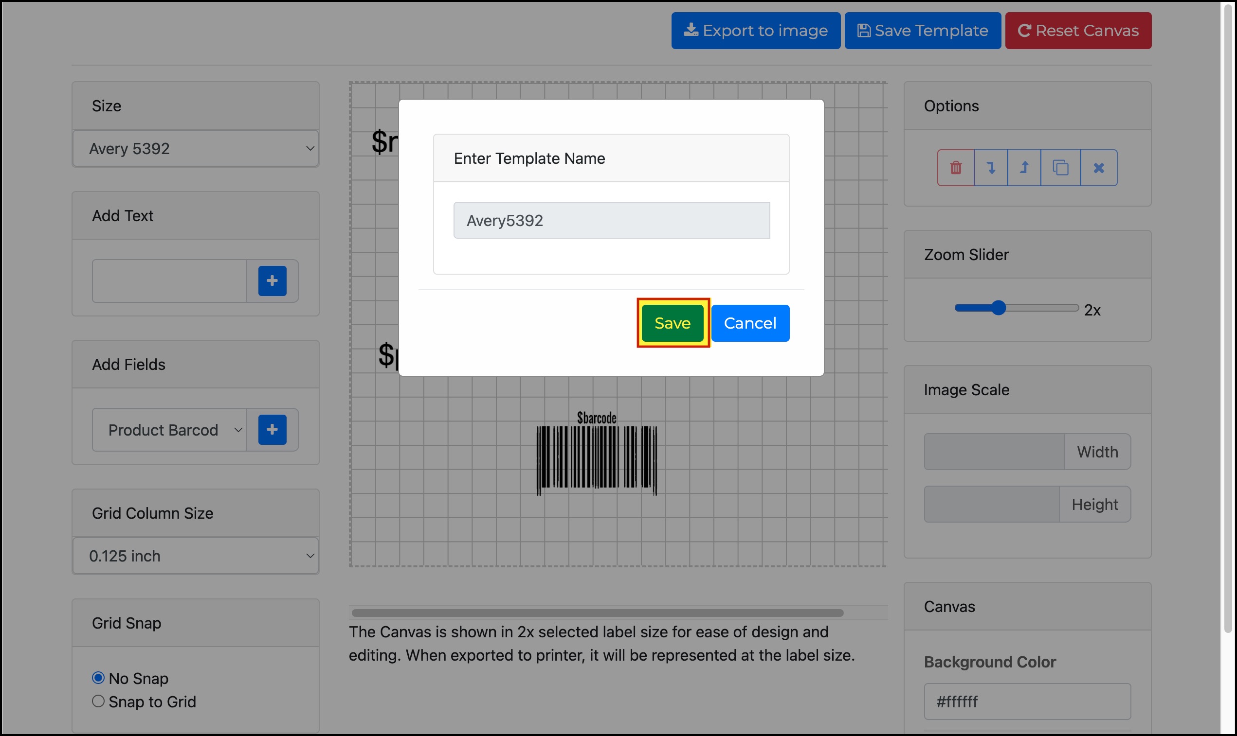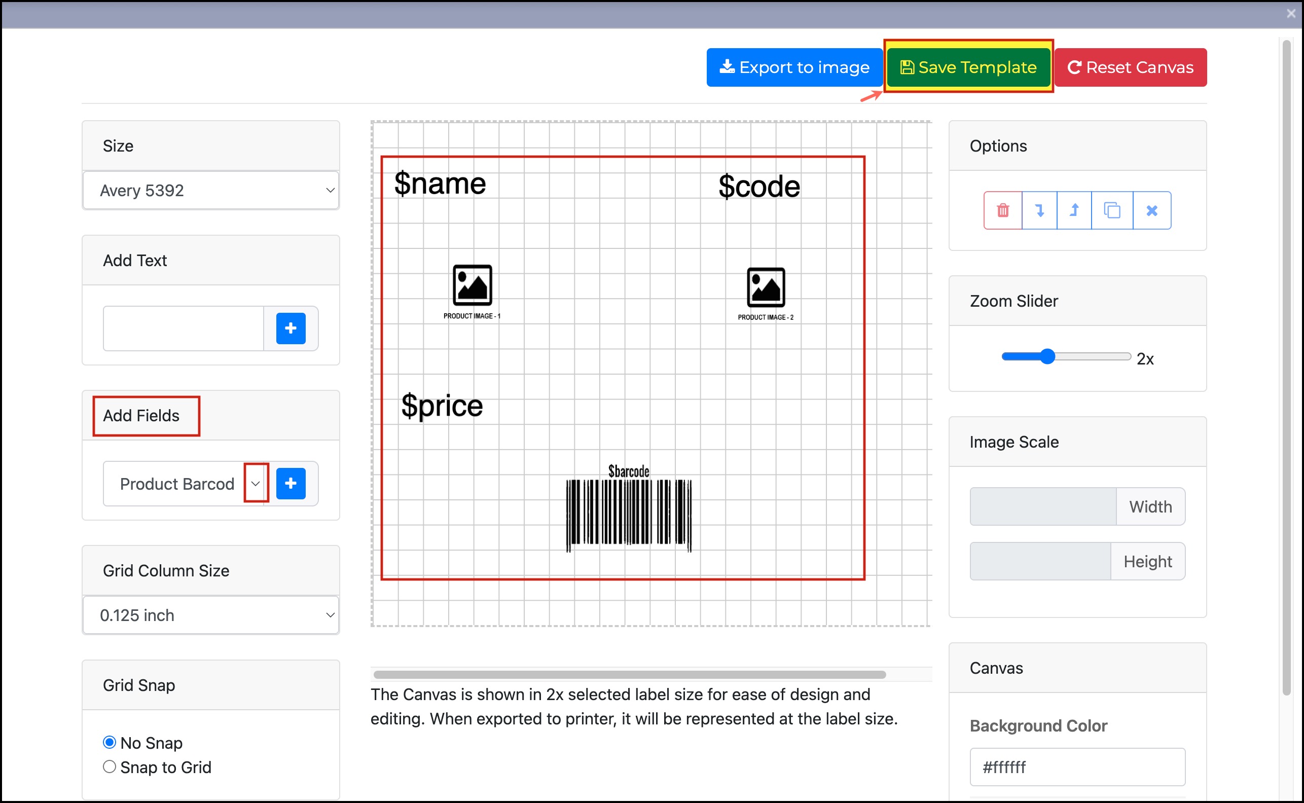 Avery 05392 is the new template style added, which you can use to print barcodes for your products. When you select this template, the default size is displayed. You can add any fields and text you want to the label.