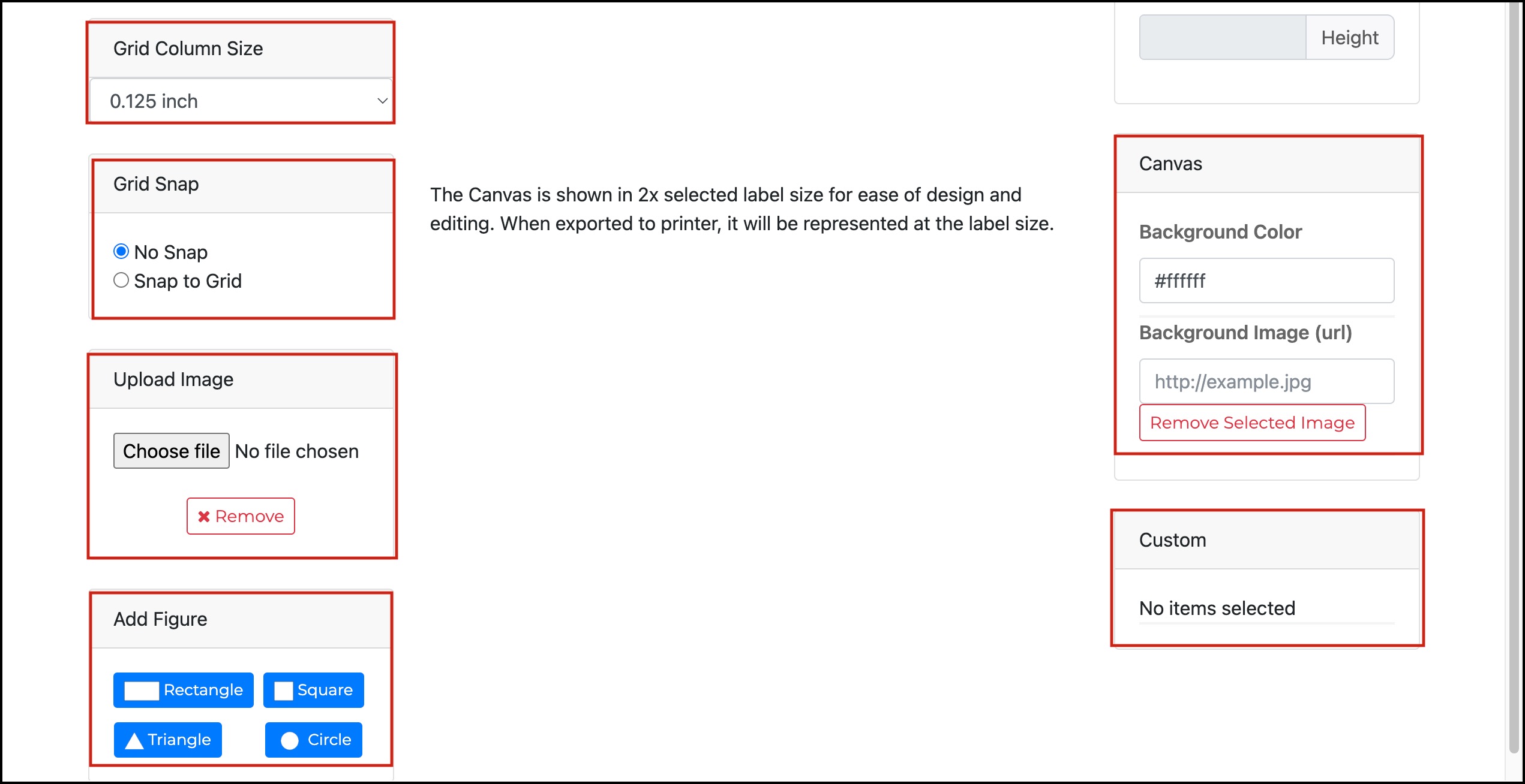 - The Size selection allows for changing the size of the Label to be printed. Changing the size here will change the size of the canvas.