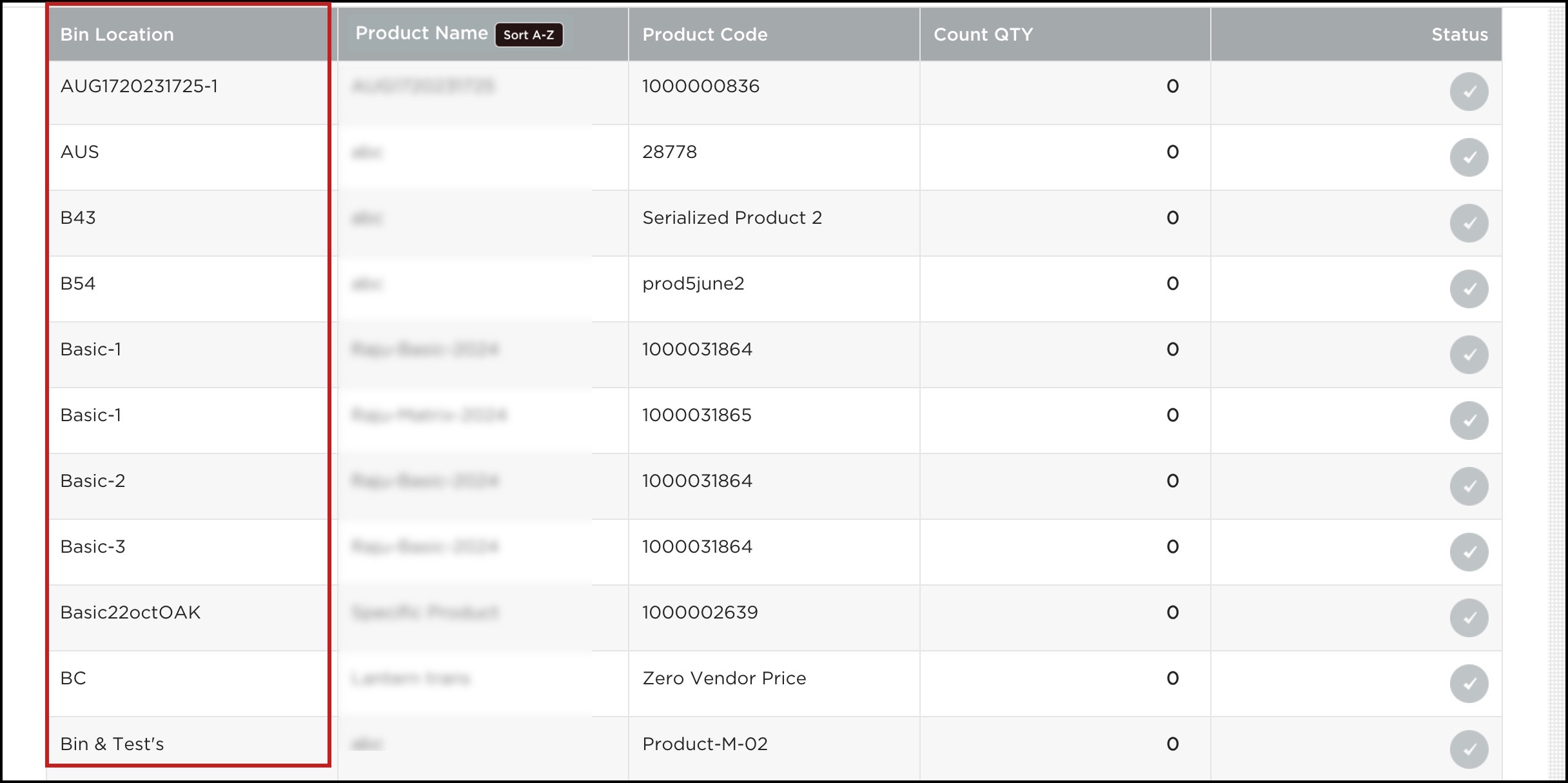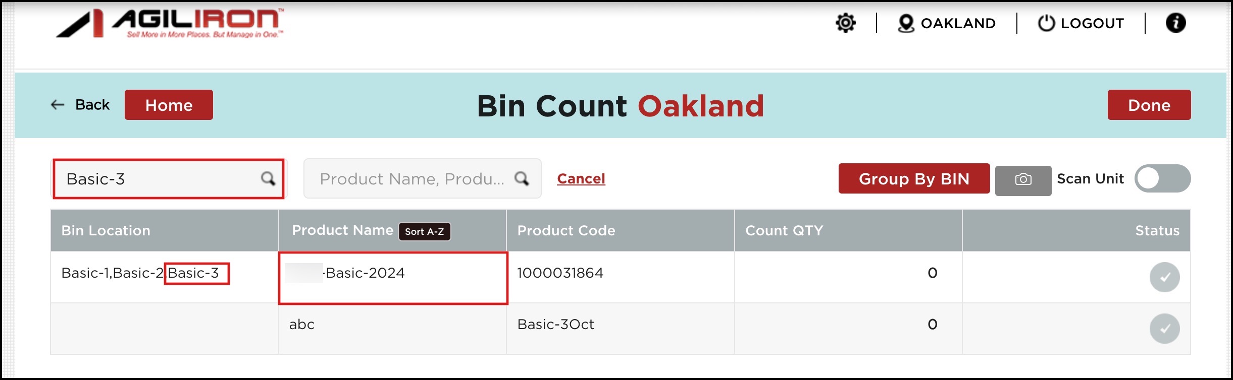 - Products can be searched by product name, code, and also by bin location.