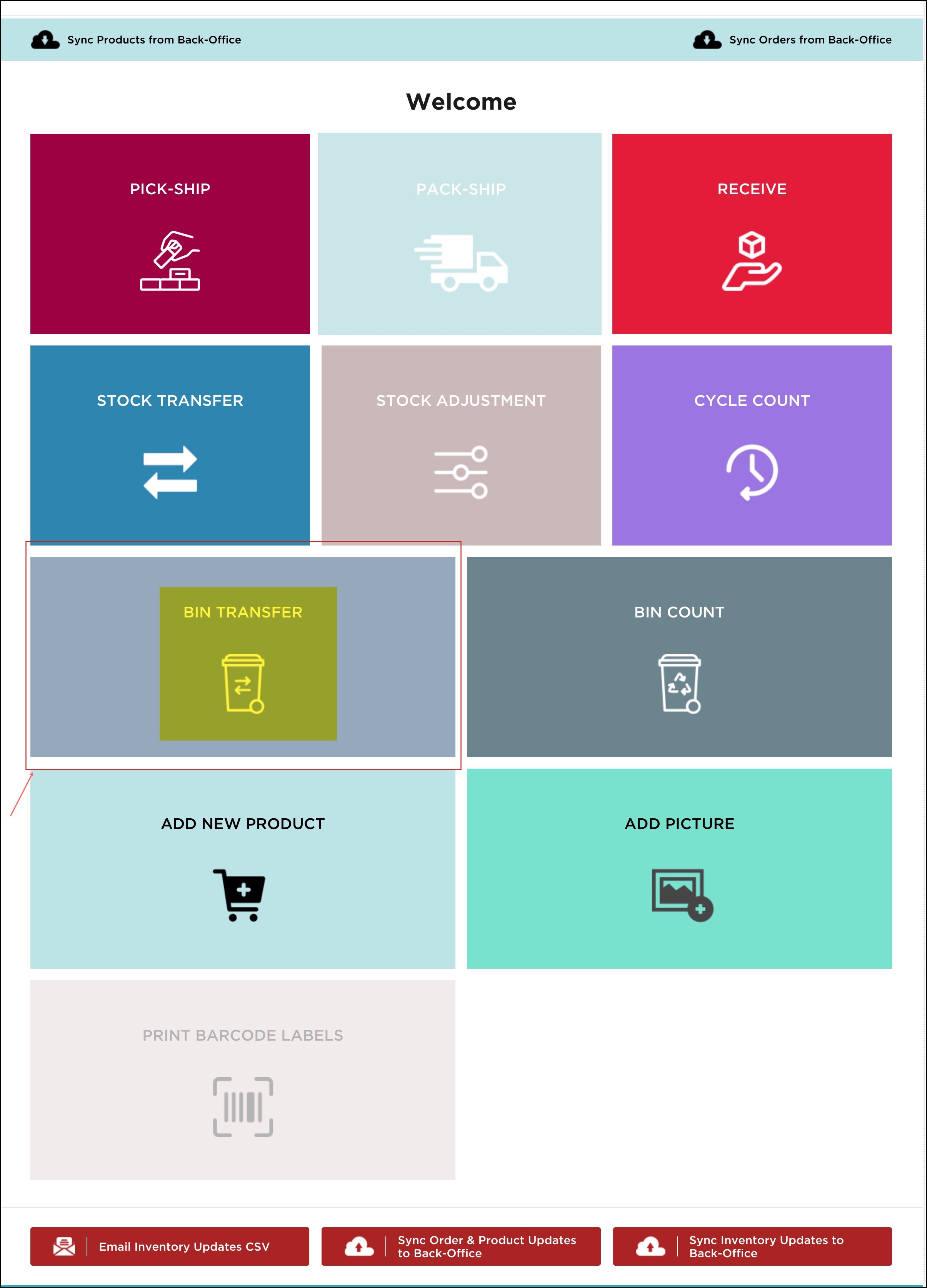 - On the warehouse management app home screen, click on the Bin Transfer workflow button.