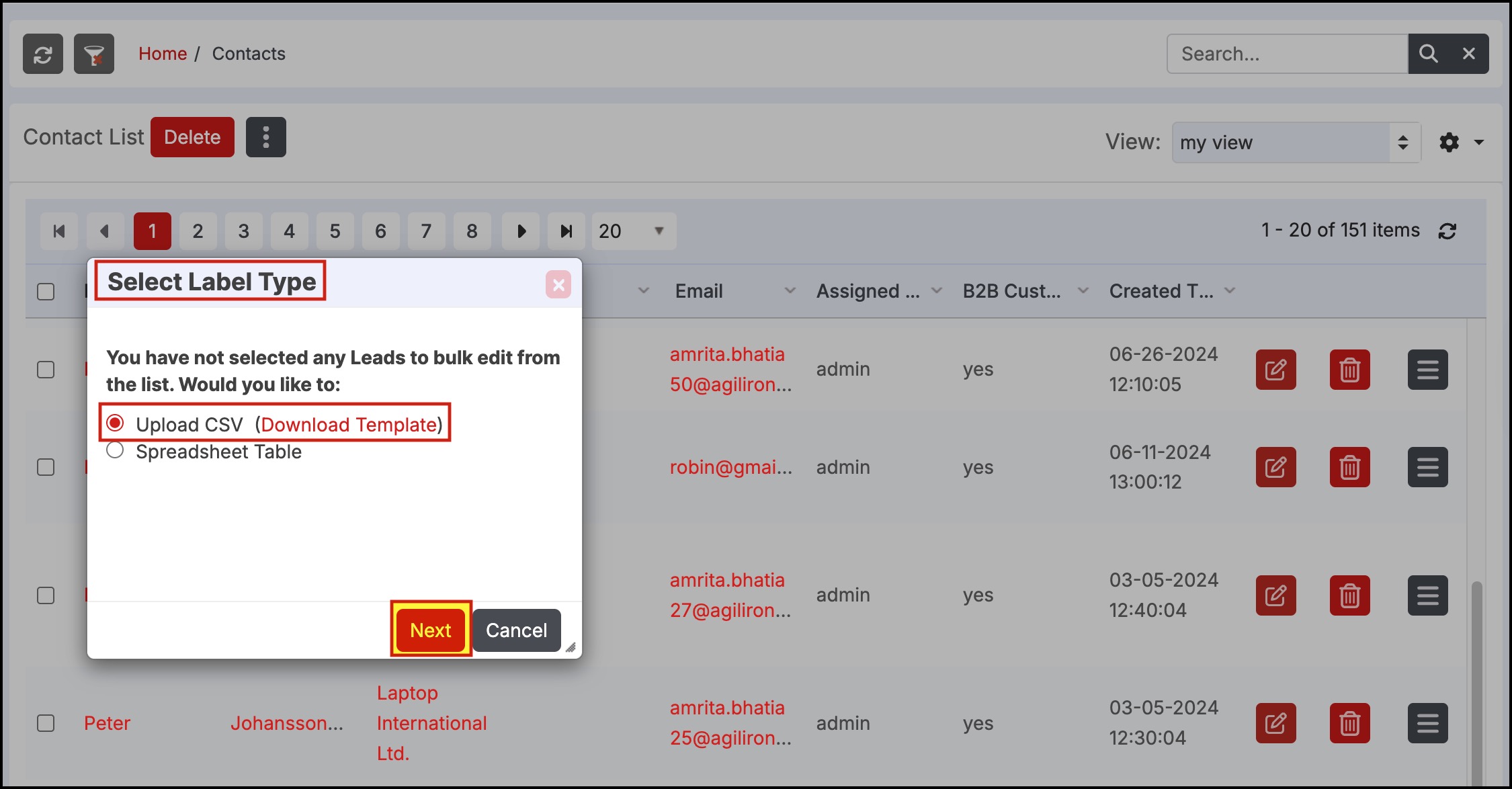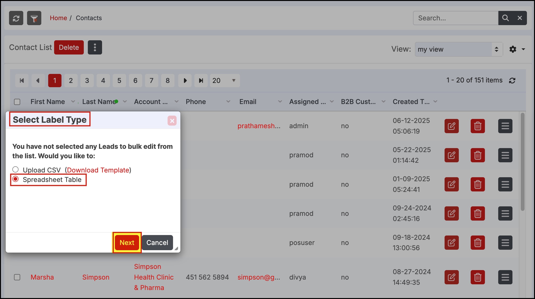 Select Label Type window will pop up with two options to upload contacts for bulk edit - 'Upload CSV' or 'Spreadsheet Table'.