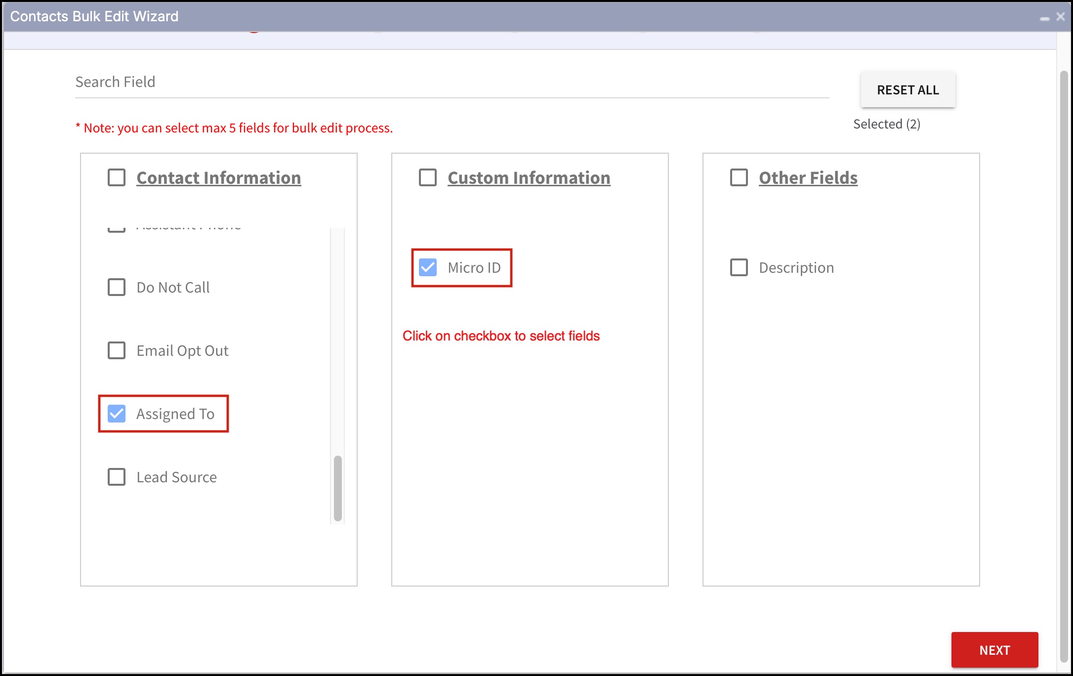 - Select all fields (max 5 fields) of a particular segment at a time by clicking on the checkbox preceding the main heading of the segment.