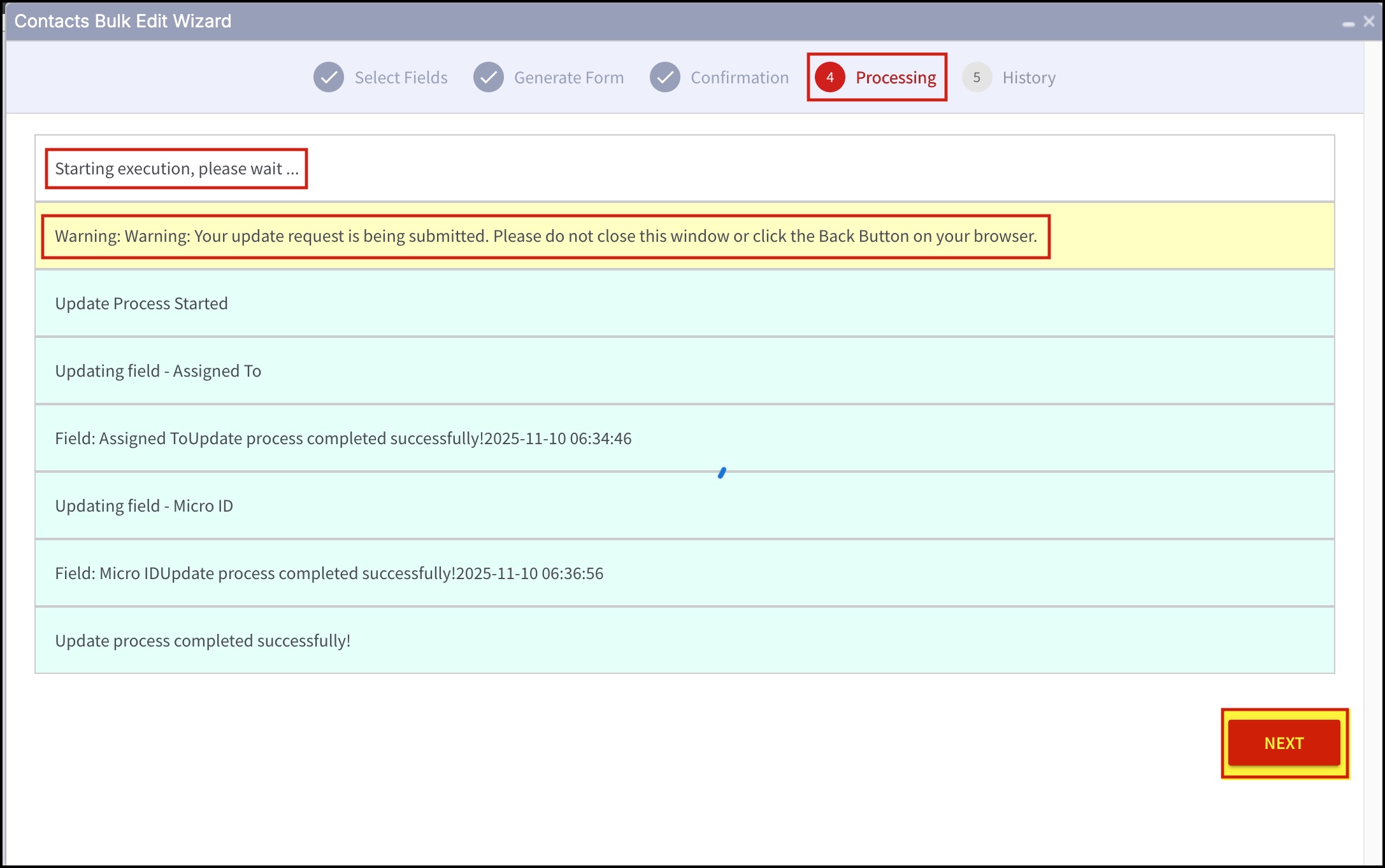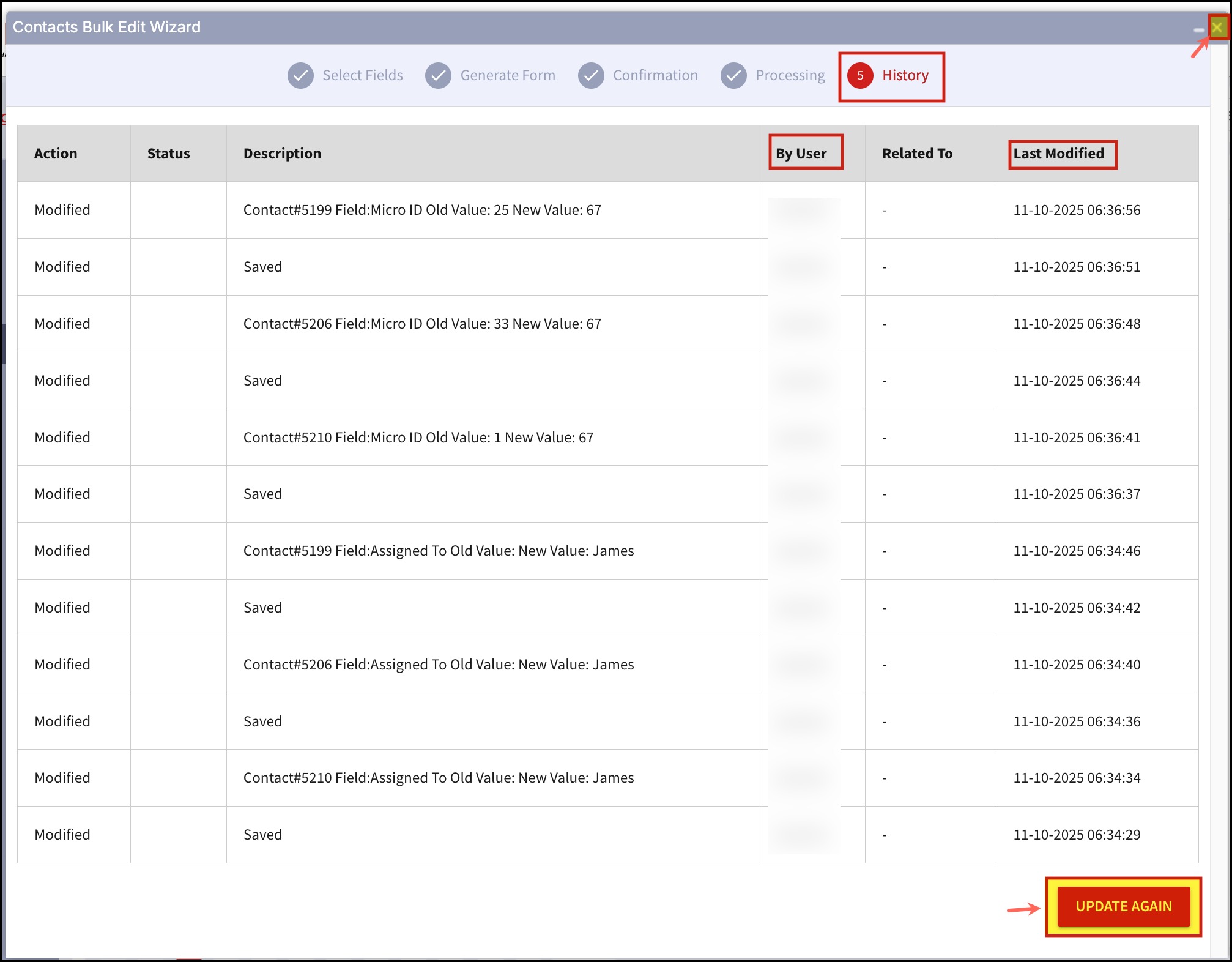 - After the update process is completed successfully, close the window and the process will end. Custom fields for the mentioned contact IDs will get updated.