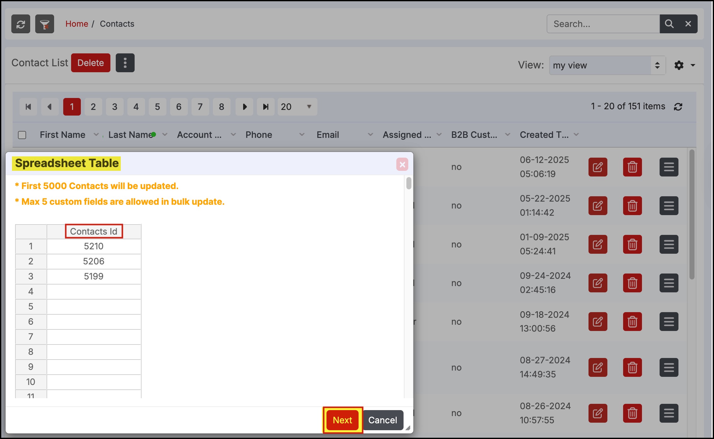 If the spreadsheet table contains only contact IDs, click on Next to proceed with further steps.