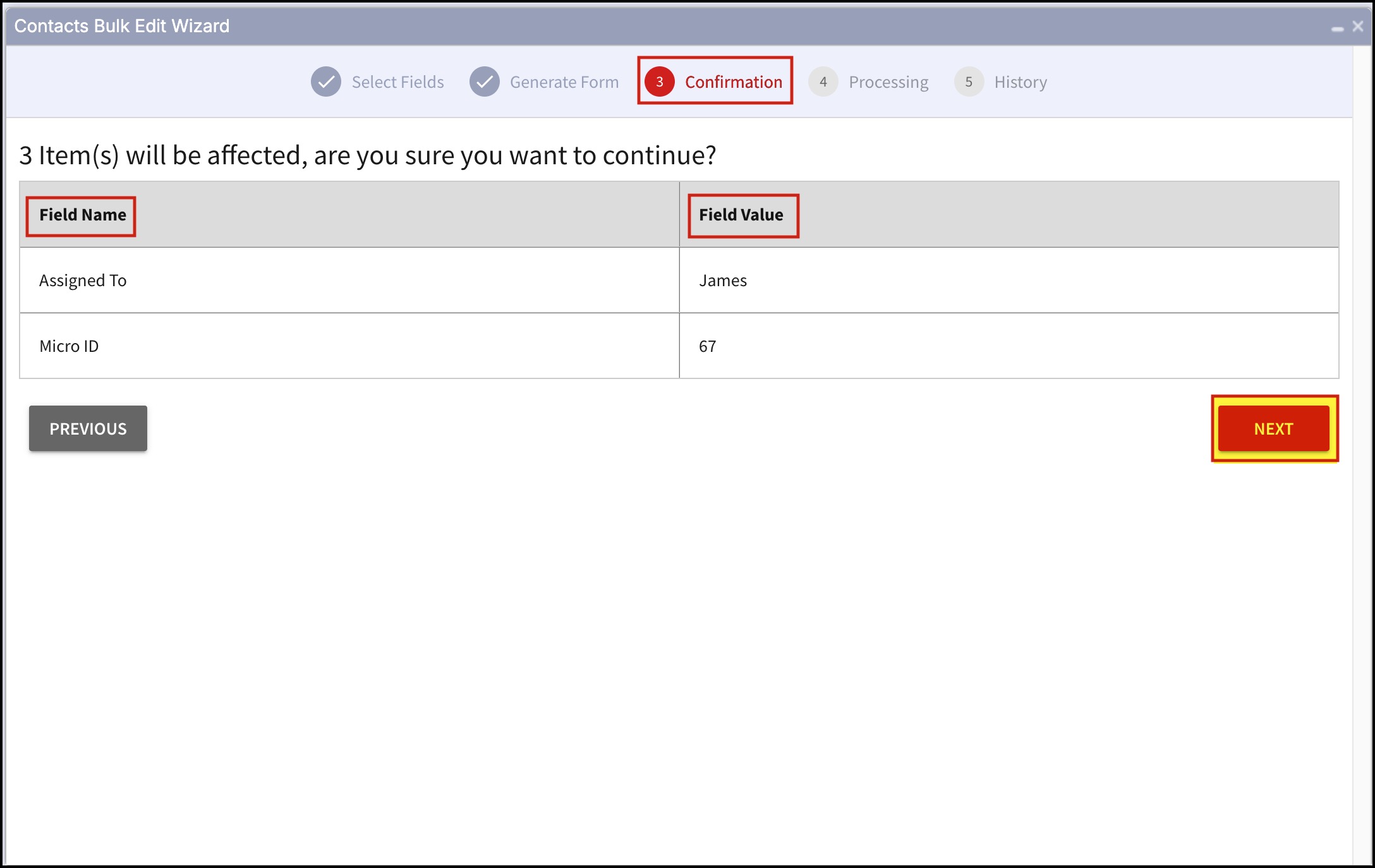 - In Confirmation, you can see the Field names and Field values that you have edited for the selected contacts.