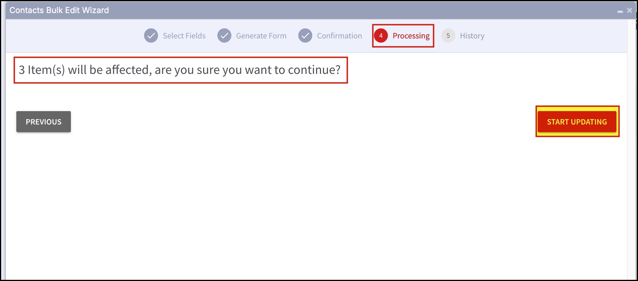 - You will be asked if you are sure to continue with the bulk edit. If yes, click on Start Updating.