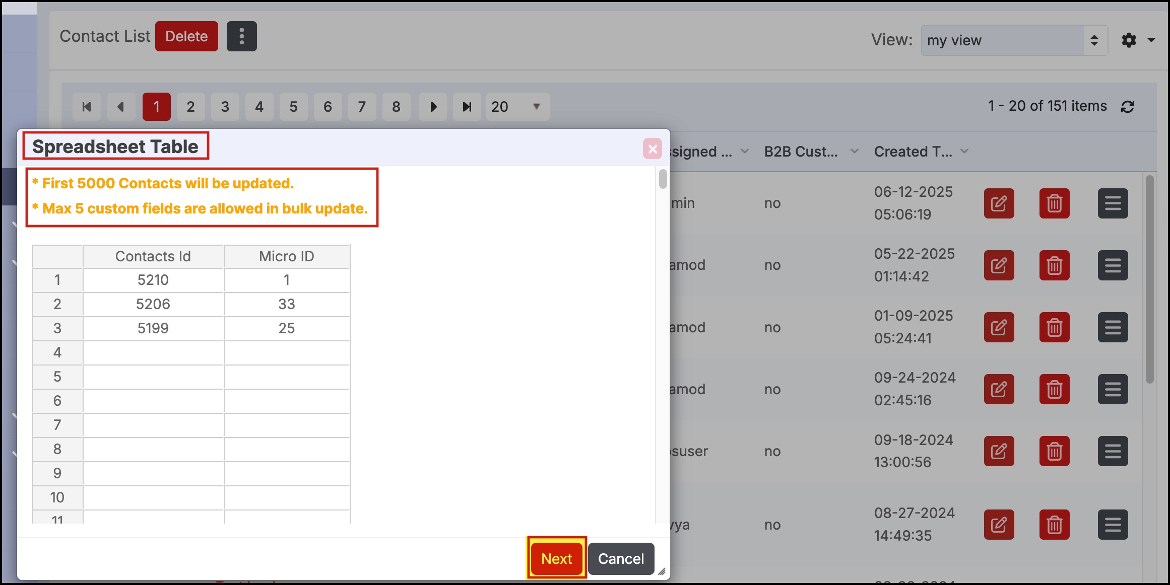 The new bulk edit wizard offers an additional feature. Users can now either upload a CSV file or enter the Contact IDs in a spreadsheet. Bulk edit will be performed only on those contacts.