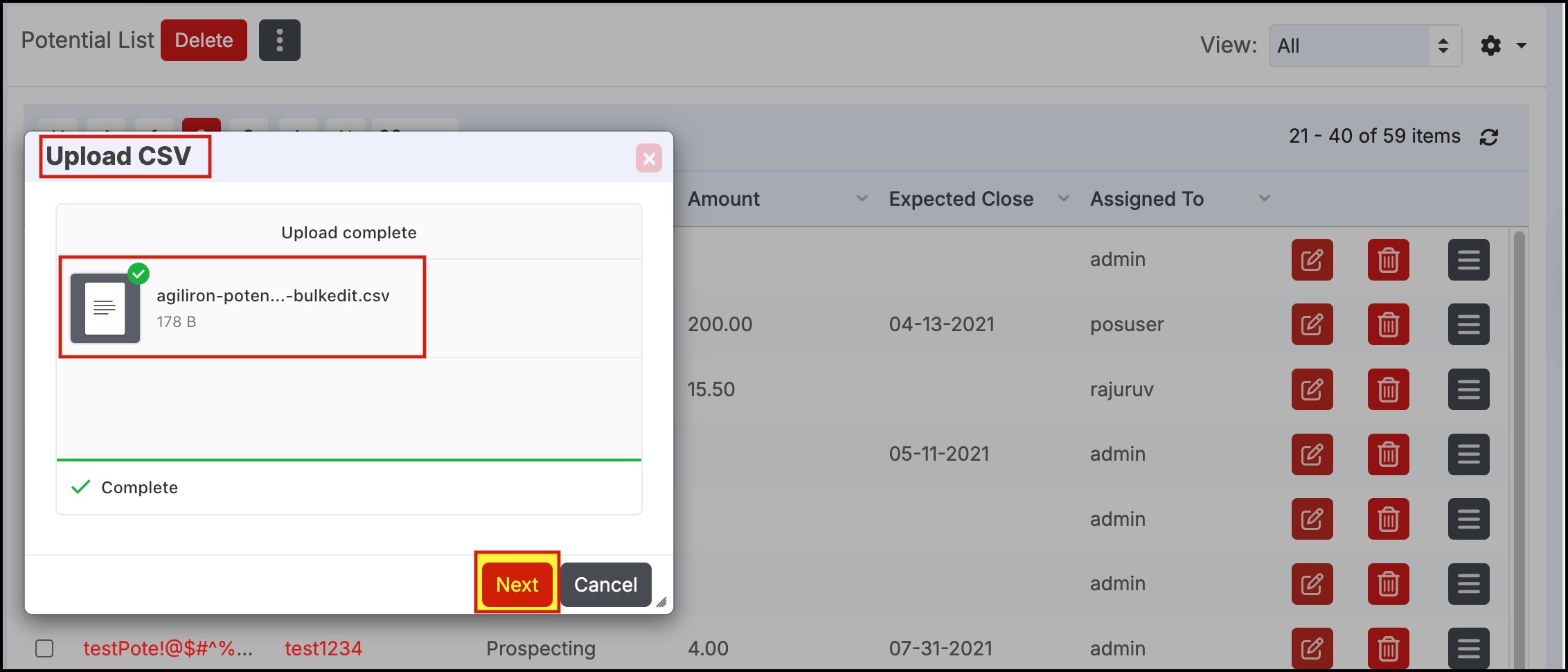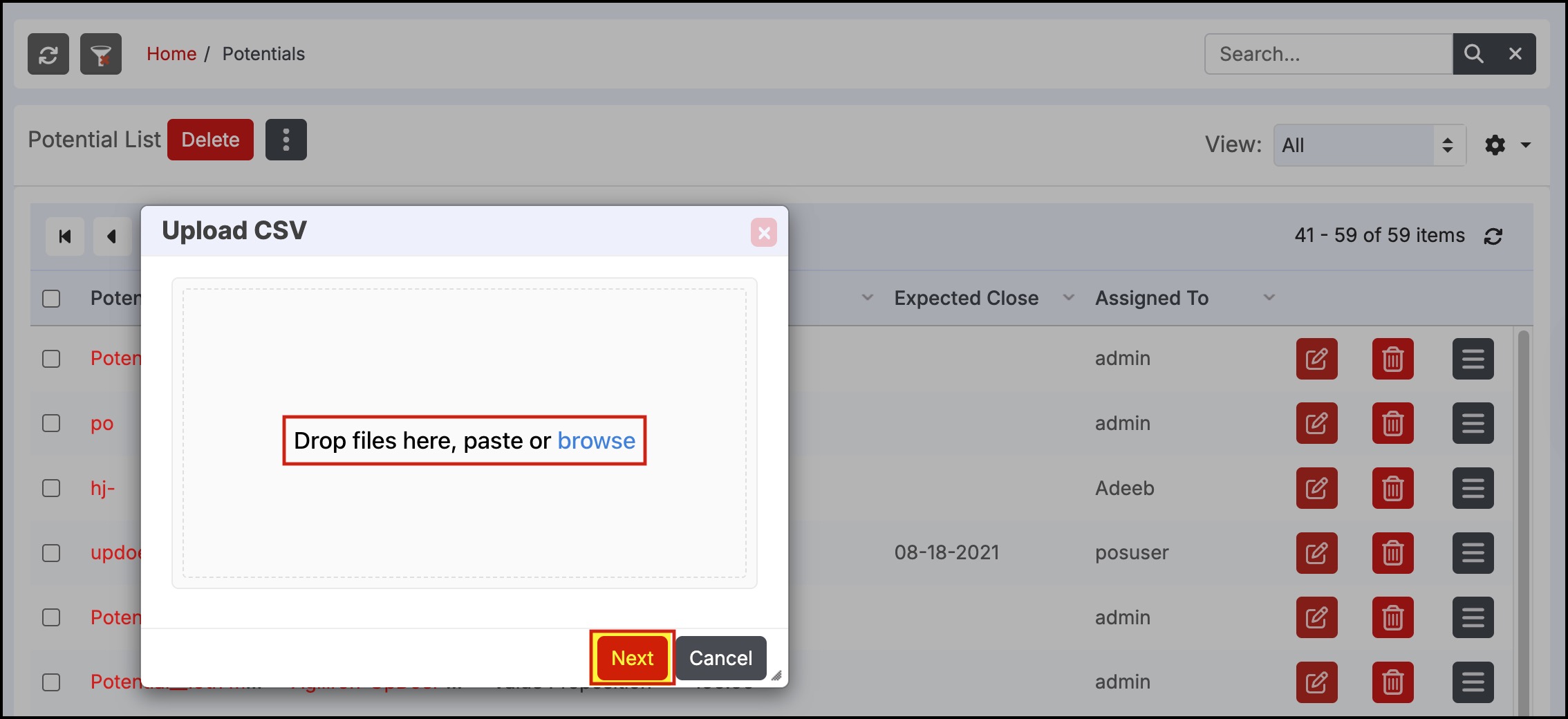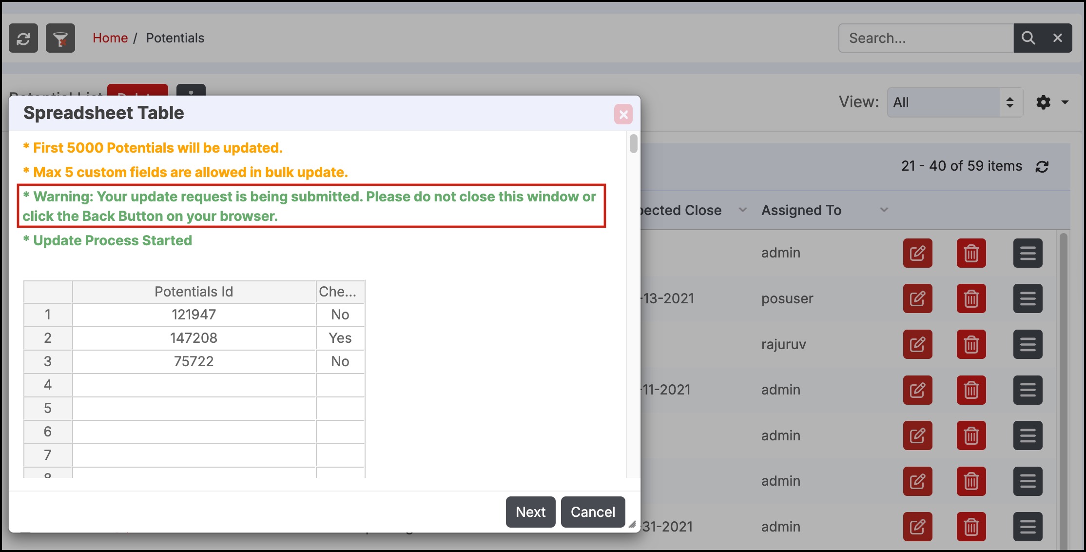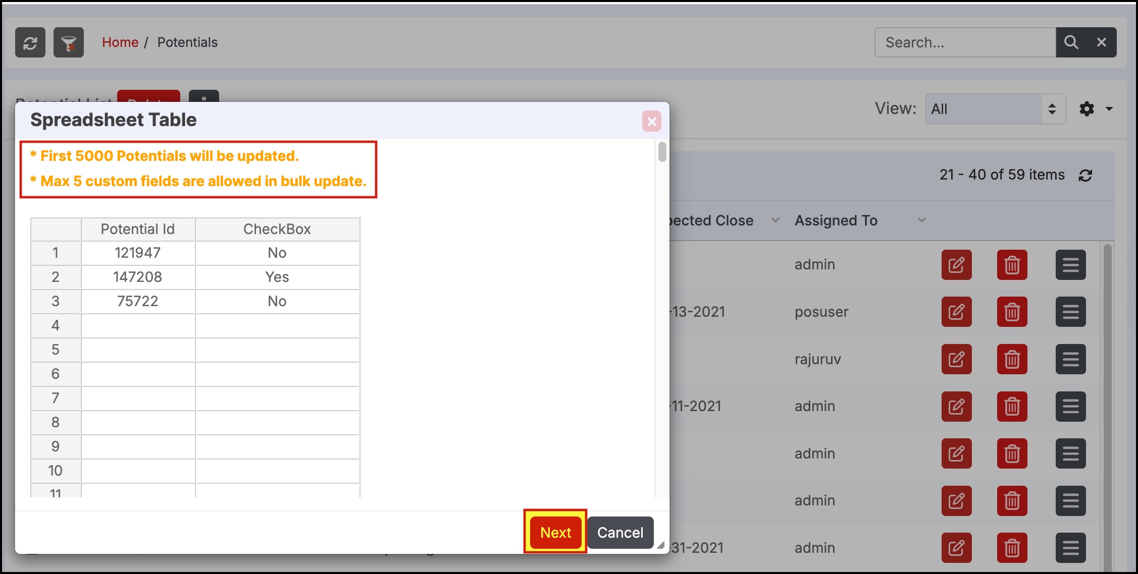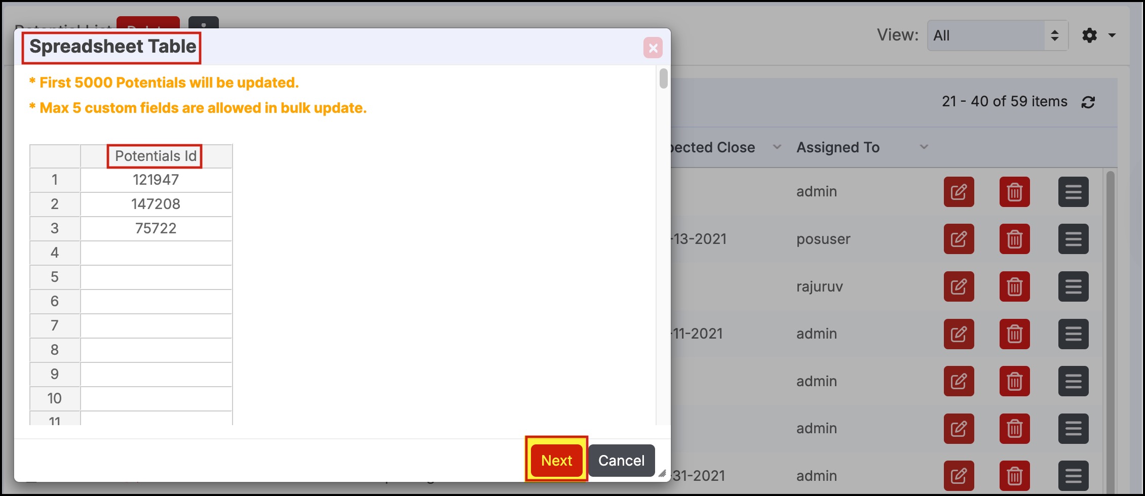 The new bulk edit wizard offers an additional feature. Users can now either upload a CSV file or enter the Potential ids in a spreadsheet. Bulk edit will be performed only on that specific potentials. There is no need to select the potentials prior.