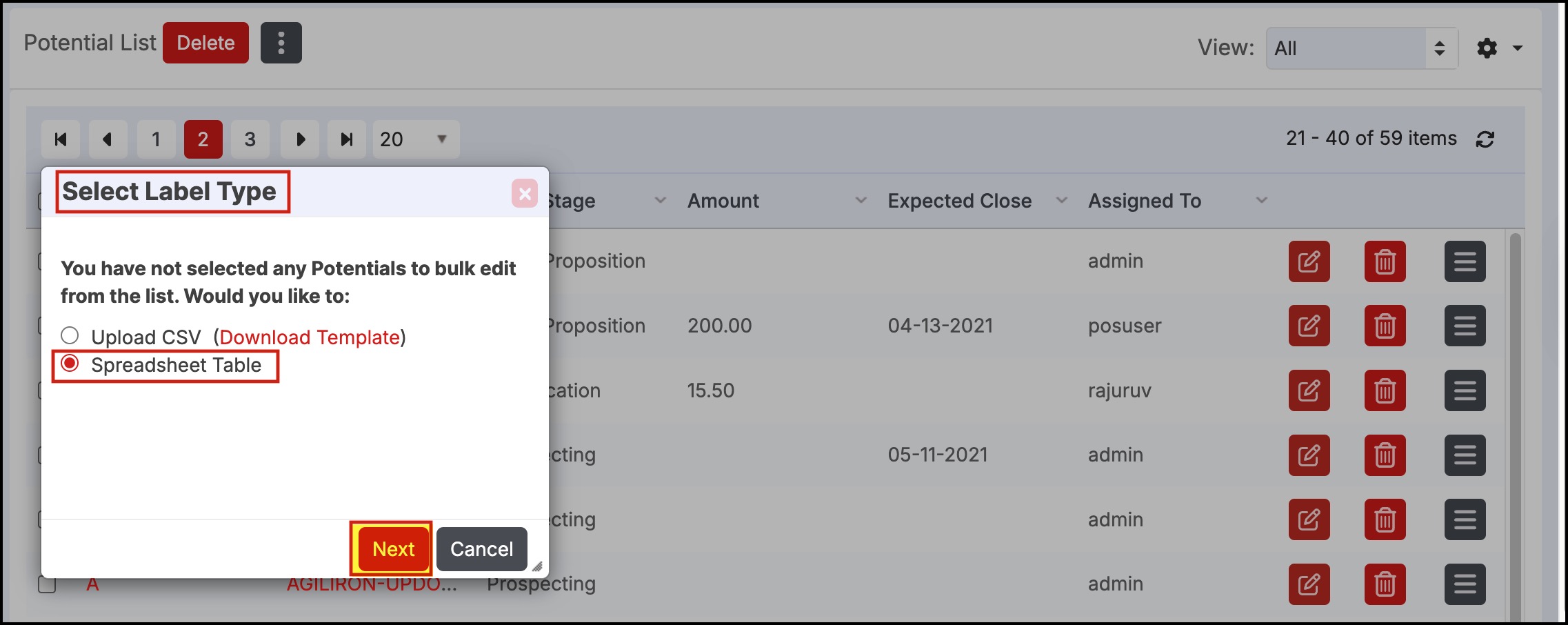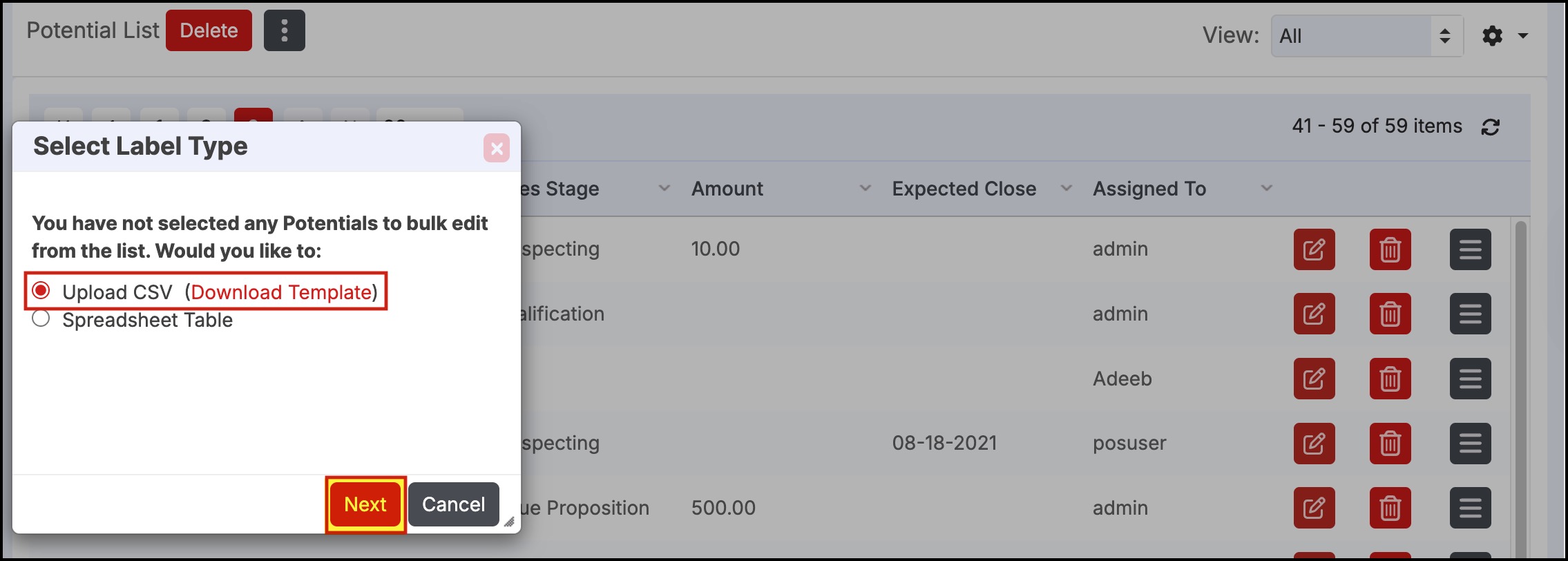 Select Label Type window will pop up with two options to upload potentials for bulk edit - 'Upload CSV' or 'Spreadsheet Table'.