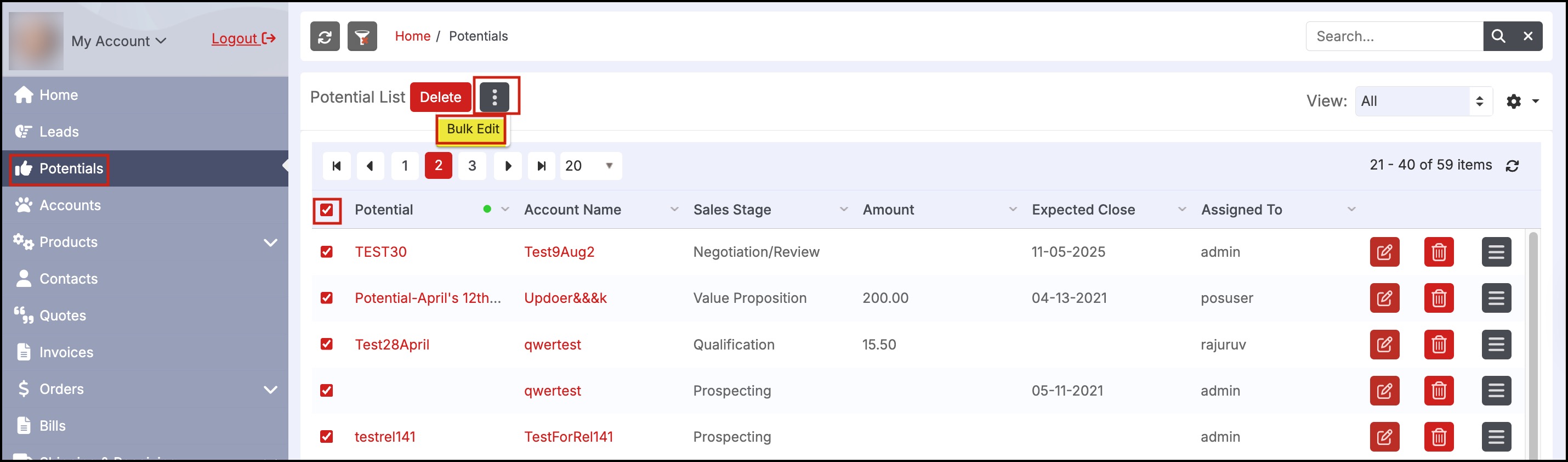 Bulk Edit enables to quickly edit multiple potentials and its relevant fields in a seamless manner.