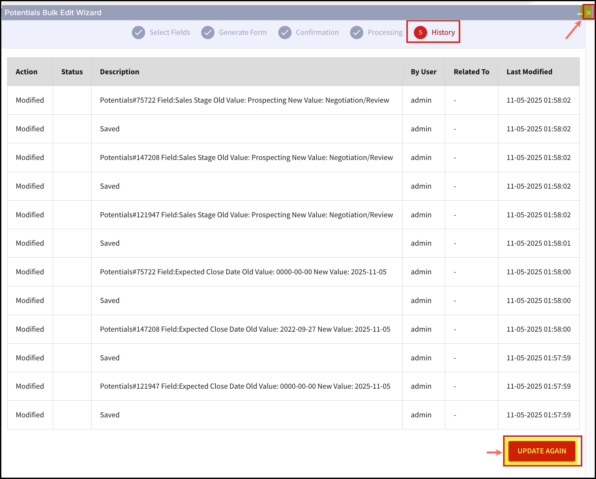 - After the update process is completed successfully, close the window and the process will end. Custom fields for the mentioned potential ids will get updated.