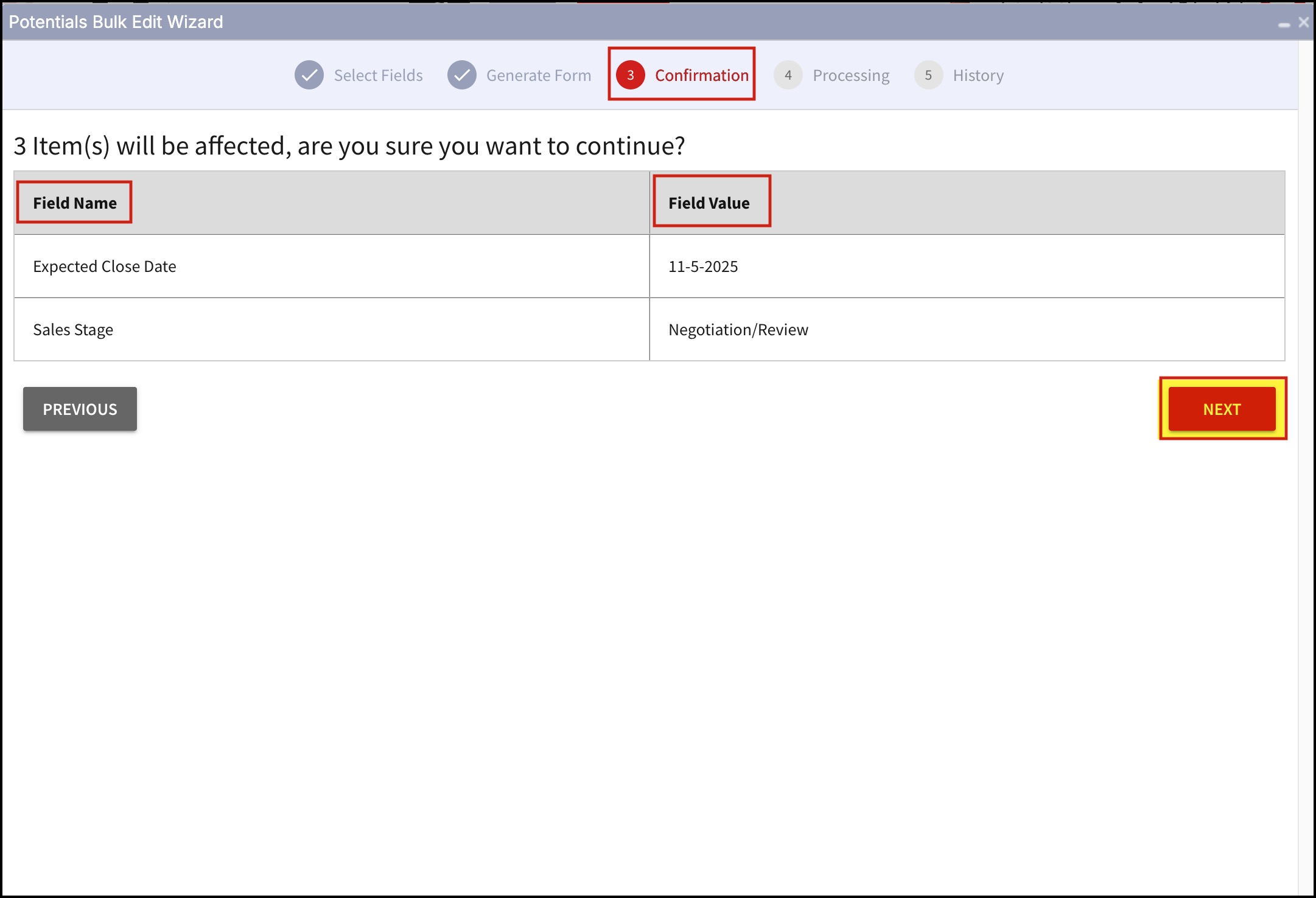 - In Confirmation, you can see the Field names and Field values that you have edited for the selected potentials.