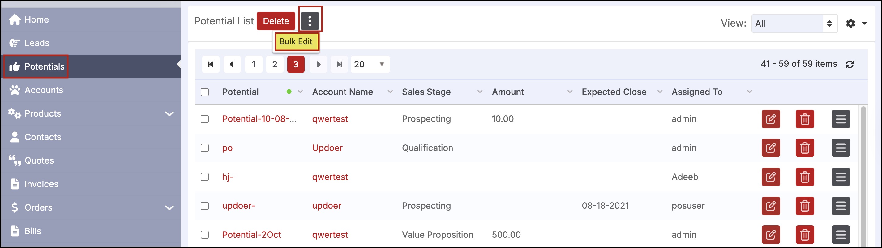 - Without selecting any potentials, click on the three dot menu and select Bulk Edit.