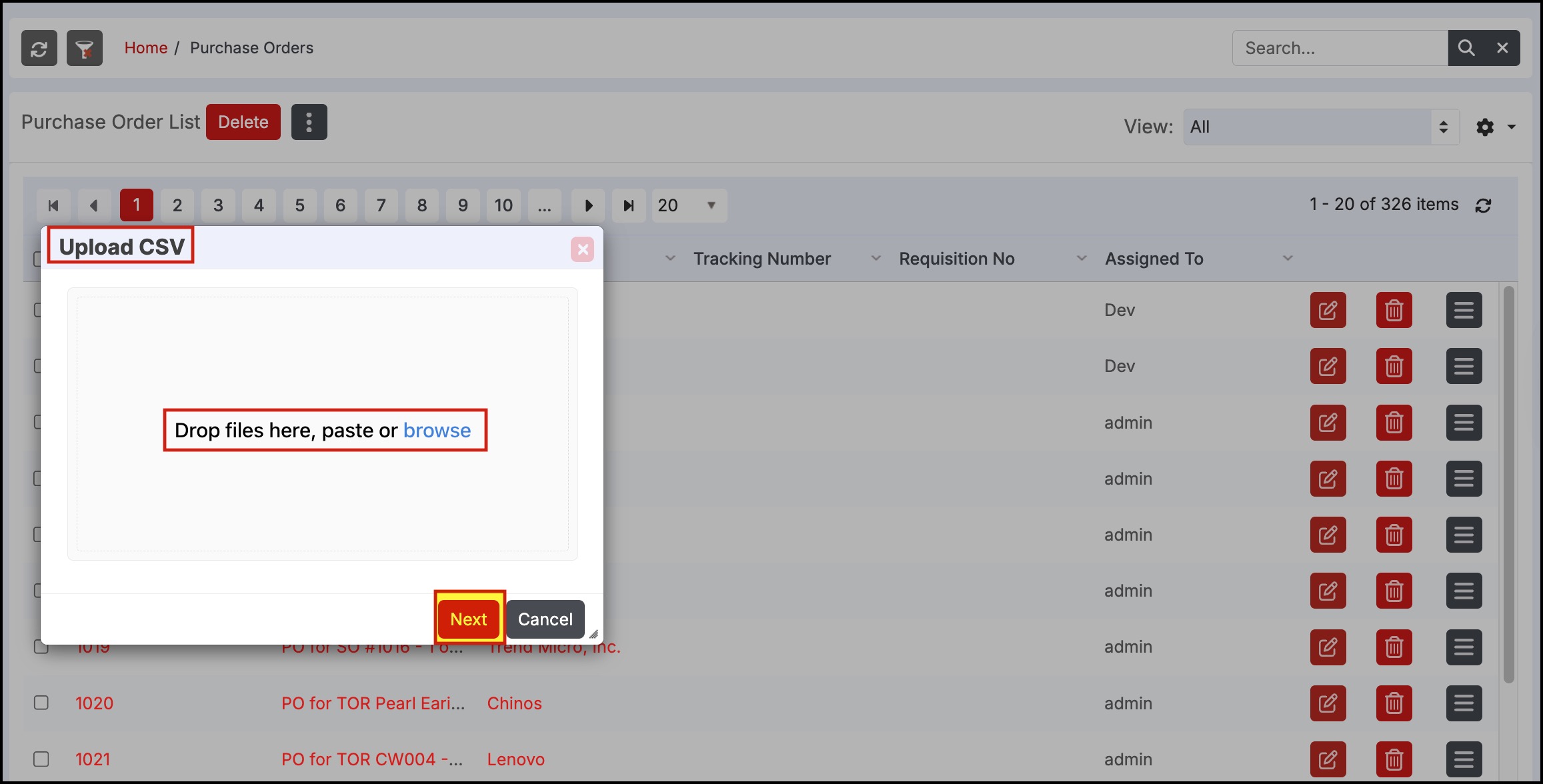 - After clicking on Next, you'll be asked to Upload CSV. Either drop a CSV file or browse the required file from your system and upload it.