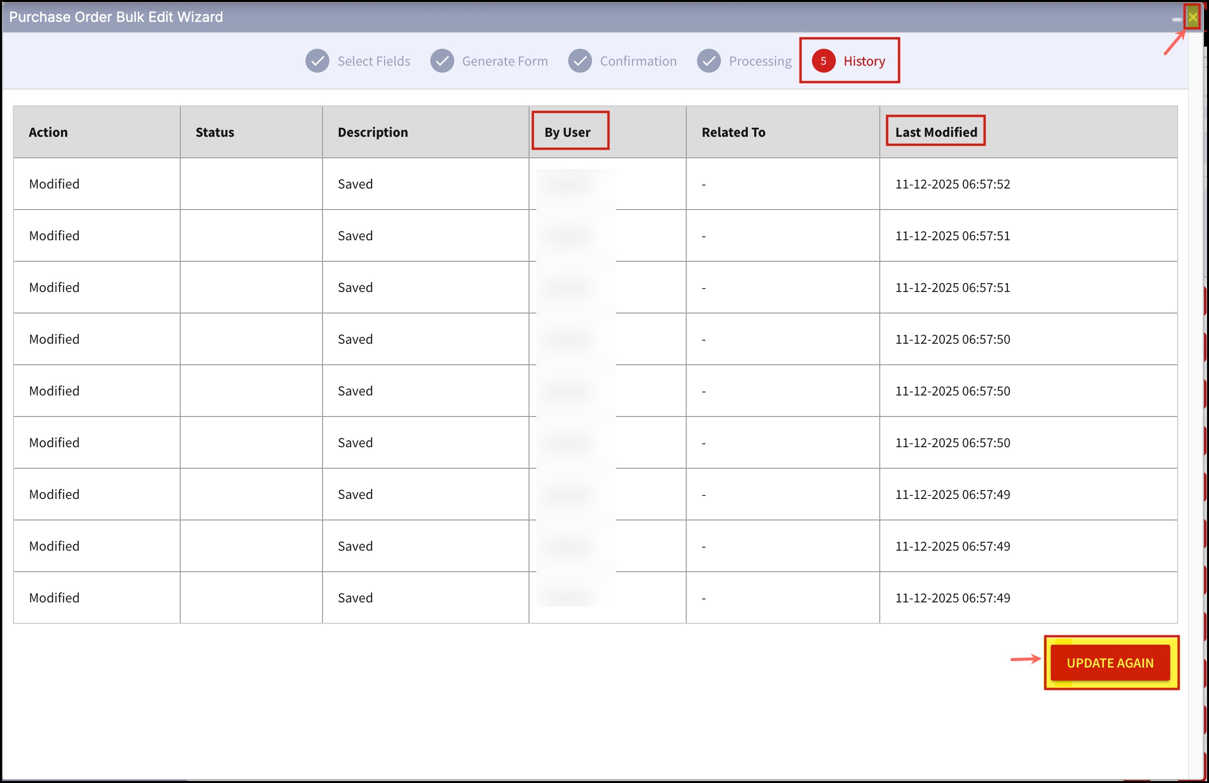 - To start again with the bulk edit process, click on the Update Again button or simply close (x) the window, if you are done with the bulk edit.