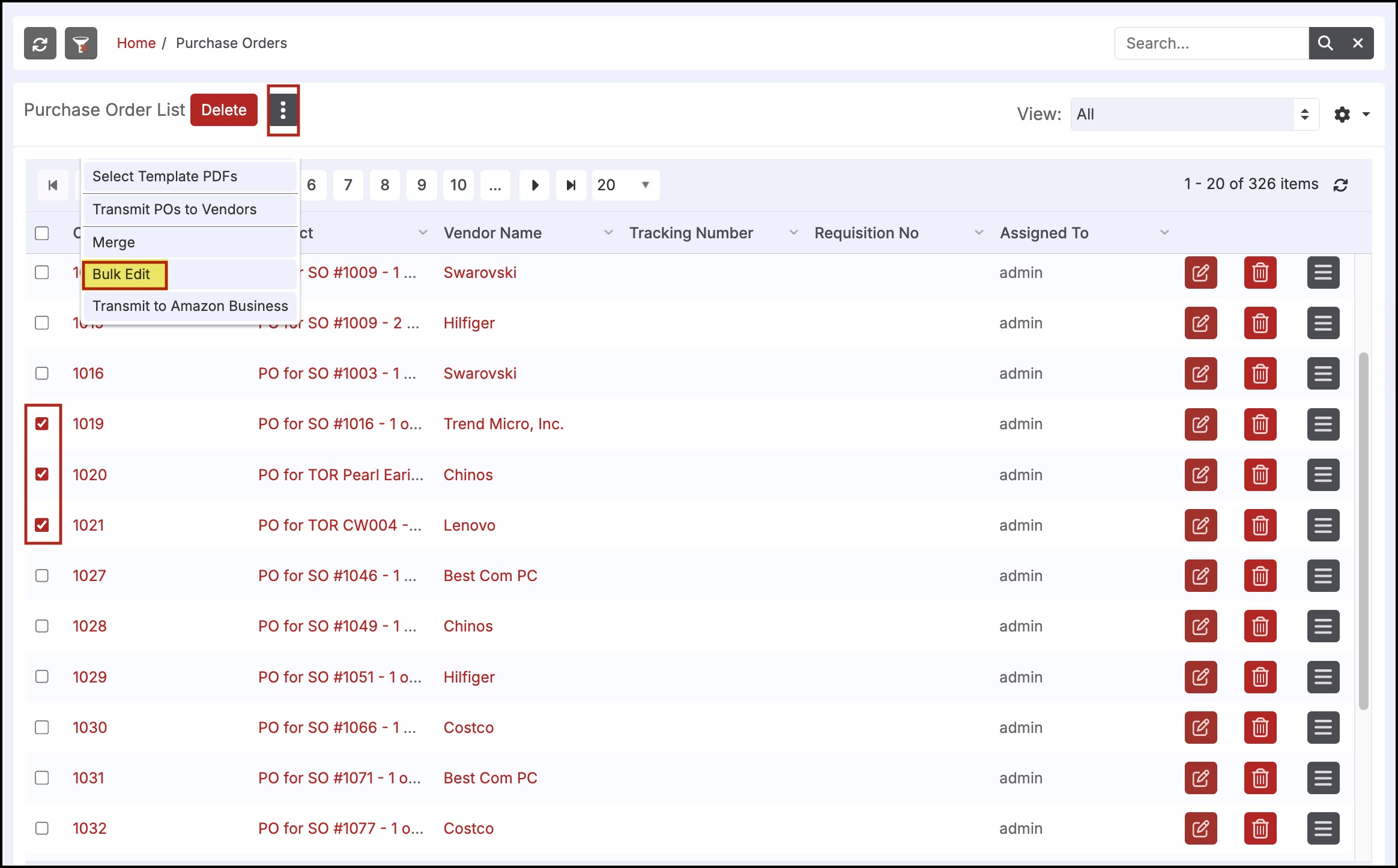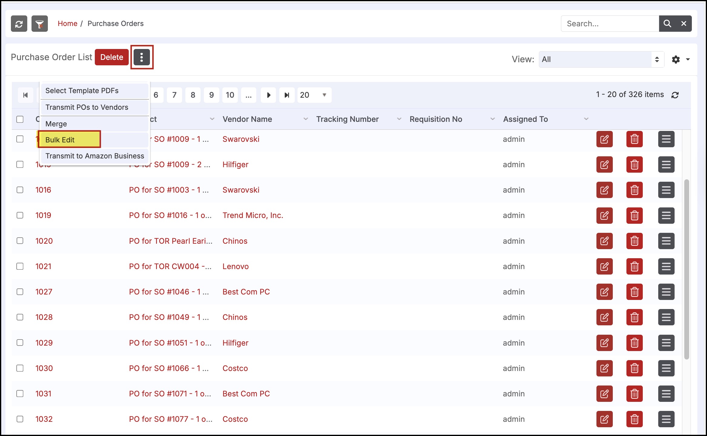 - Without selecting any order ids, click on the three dot menu and select Bulk Edit.