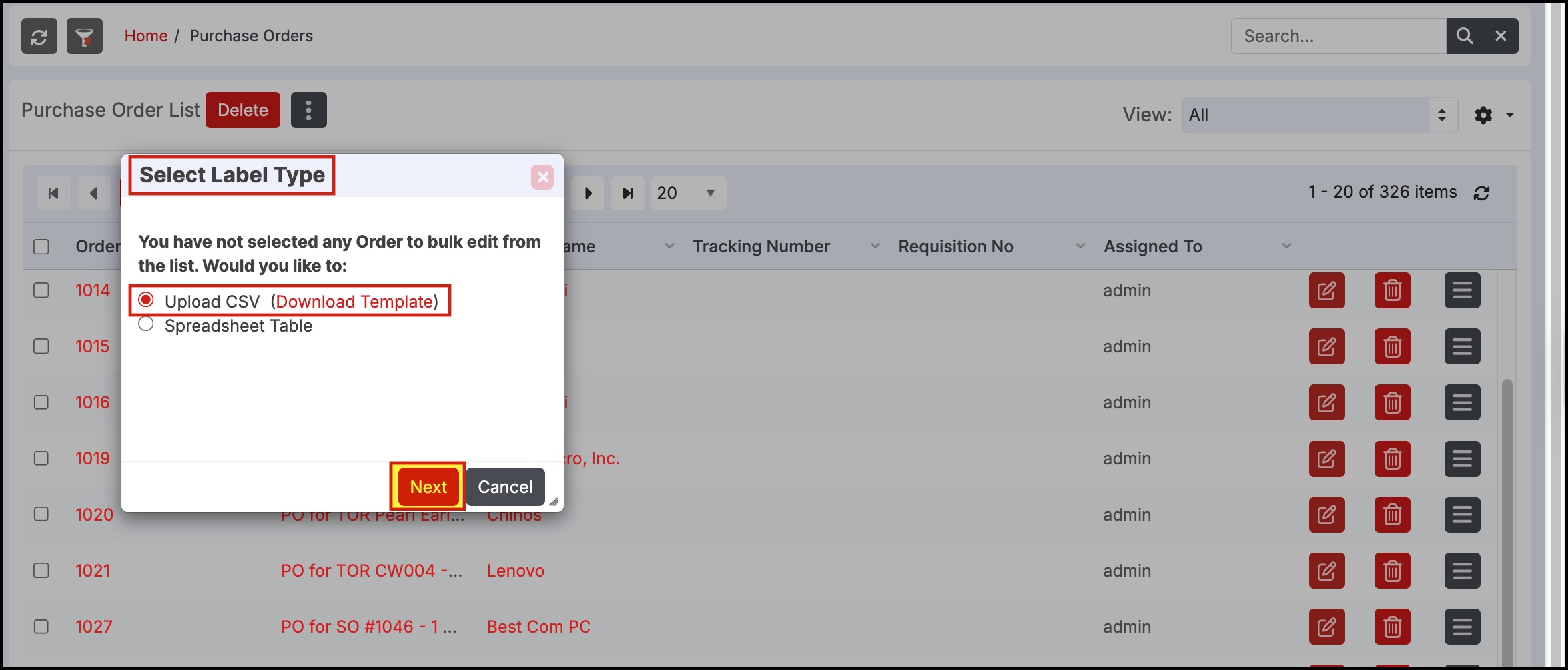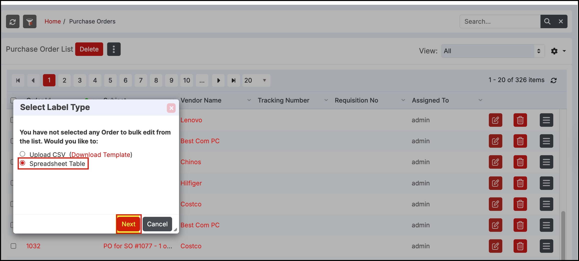 Select Label Type window will pop up with two options to upload purchase orders for bulk edit - 'Upload CSV' or 'Spreadsheet Table'.