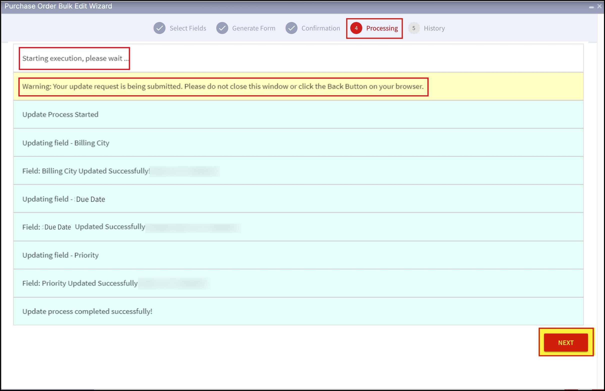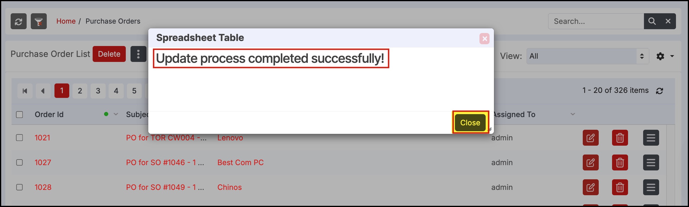 - After the update process is completed successfully, close the window and the process will end. Custom fields for the mentioned purchase order IDs will get updated.