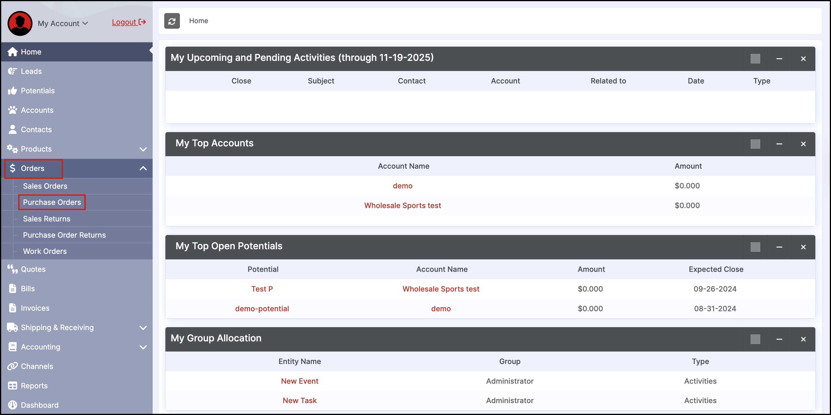 - On the left menu panel, go to Orders -> Purchase Orders.