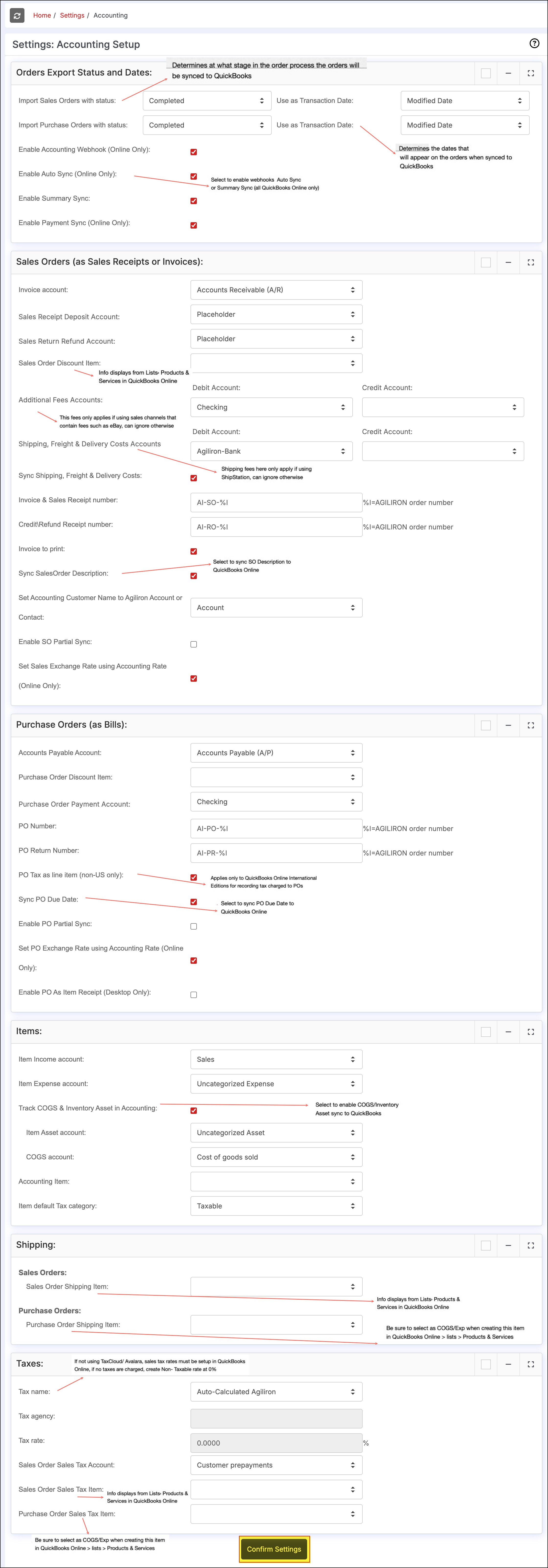 Click the "Confirm Settings" button to save any changes made. This now completes the setup for QuickBooks.