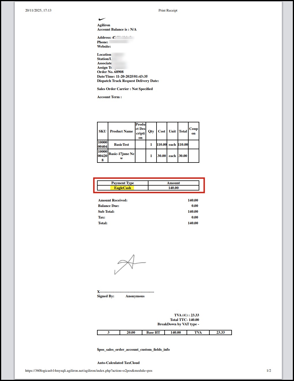 You can see the Custom payment method name (EagleCash) displayed on the receipt.