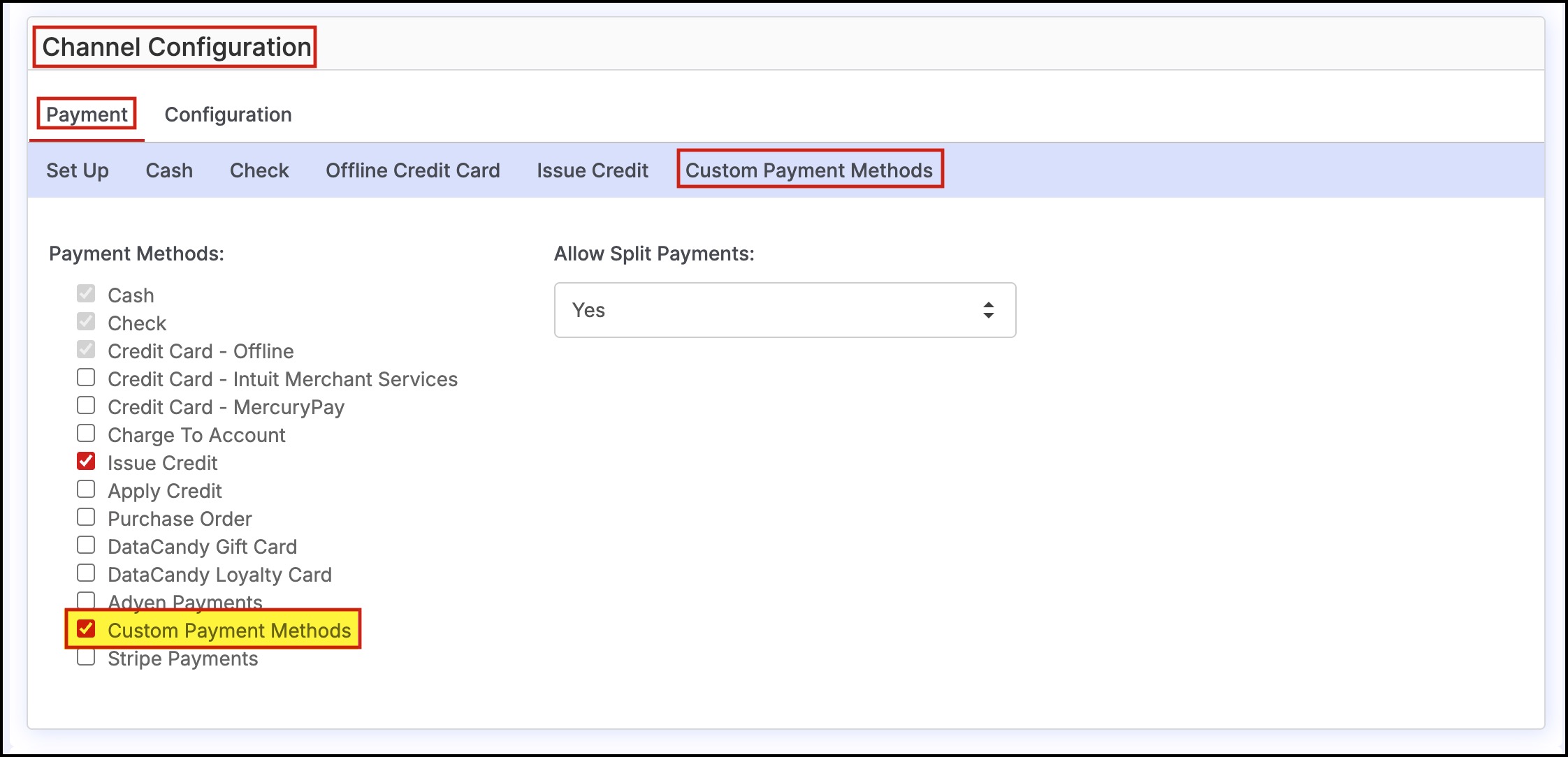 - You can see a list of Payment Methods. Click on the Custom Payment Methods checkbox.