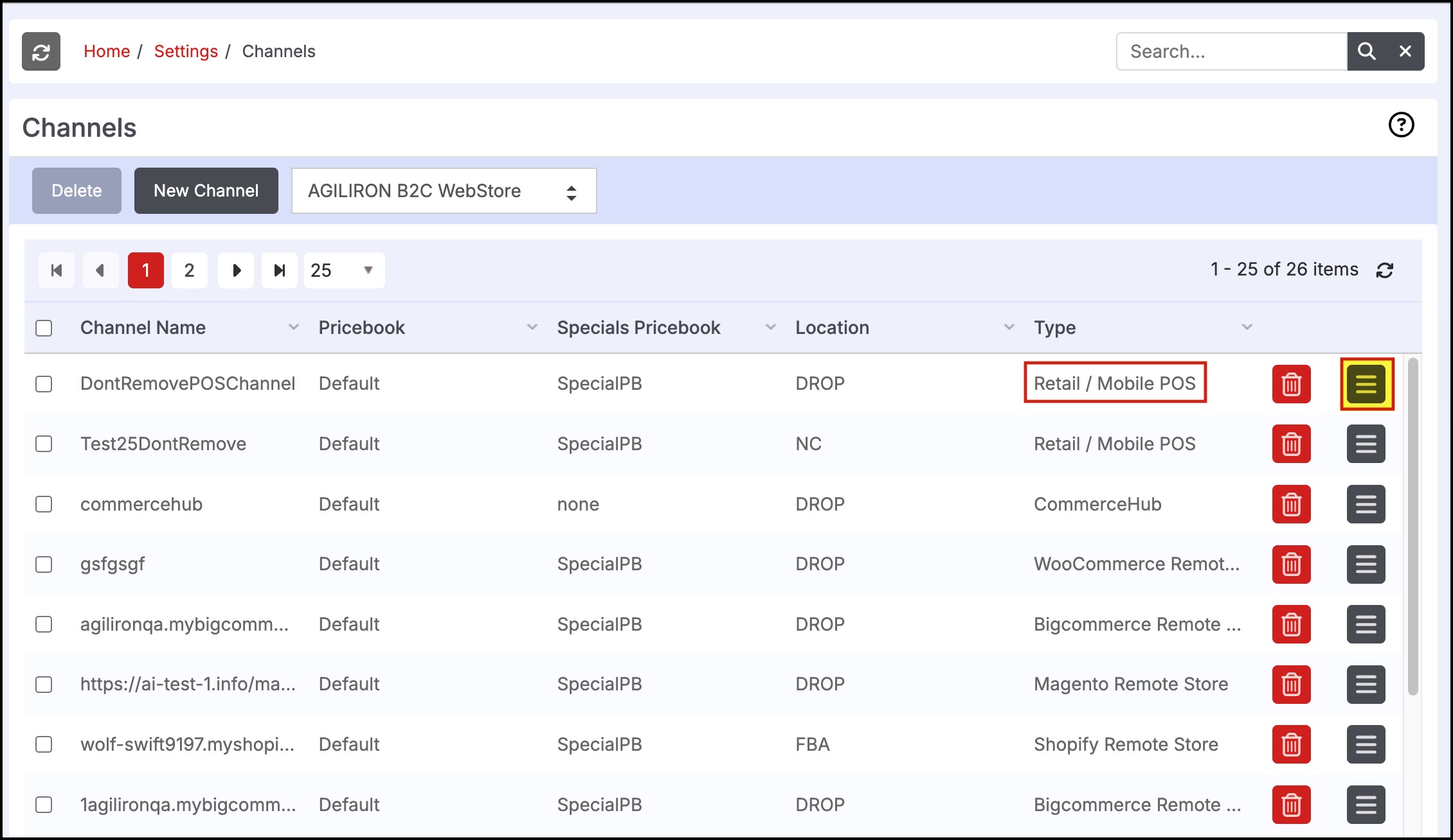 - Click on the Edit button (three horizontal lines icon) of the Retail POS sales channel you want.