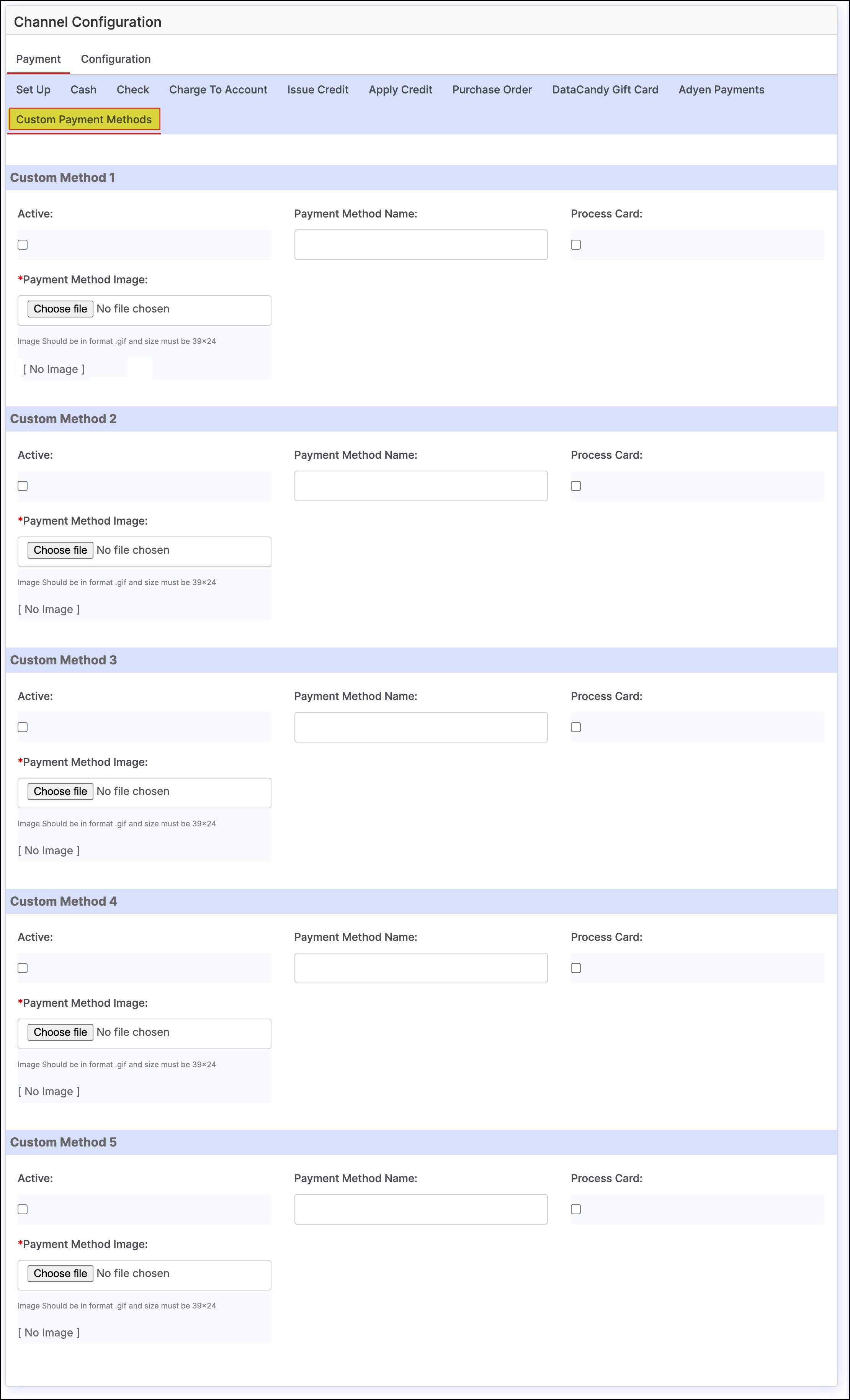 - By default 5 payment methods have been added (Custom Payment Method 1, Custom Payment Method 2, Custom Payment Method 3...), and there are individual settings for each.
