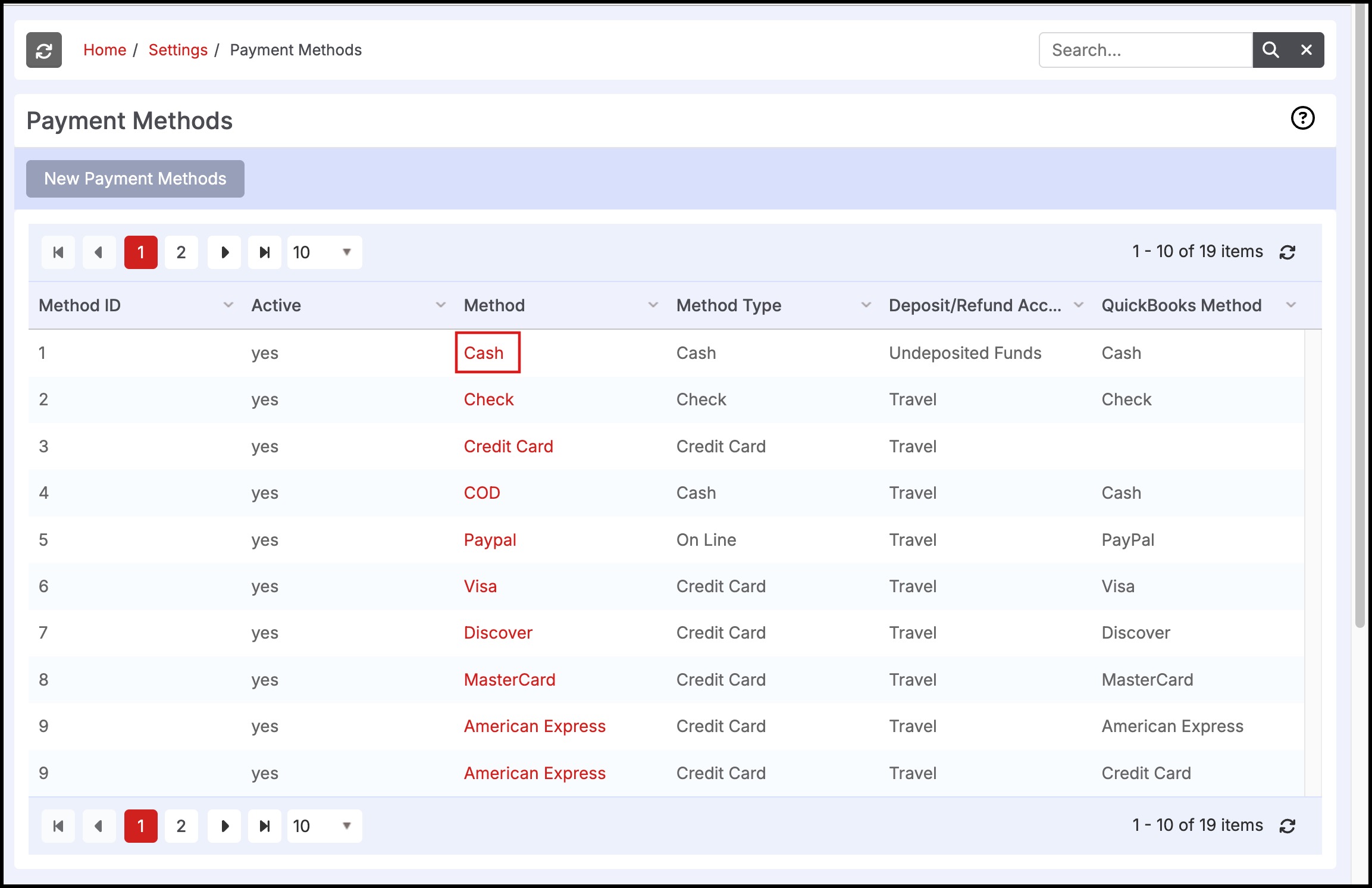 The pre-defined set of Payment methods cannot be deactivated but the Deposit Account and QuickBooks Method mapping can be modified by clicking on the "Settings > Payment Methods > Payment Method" link.