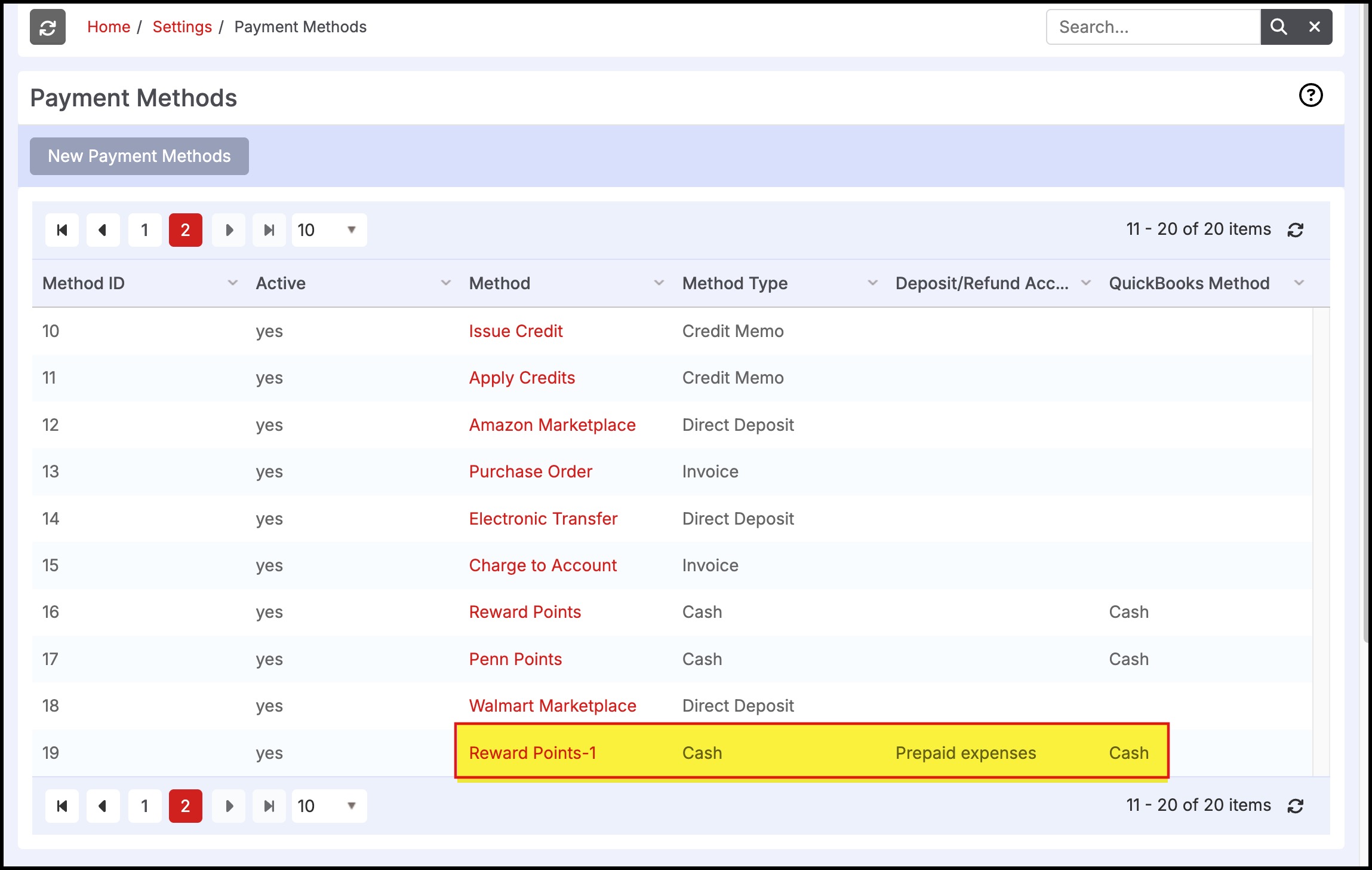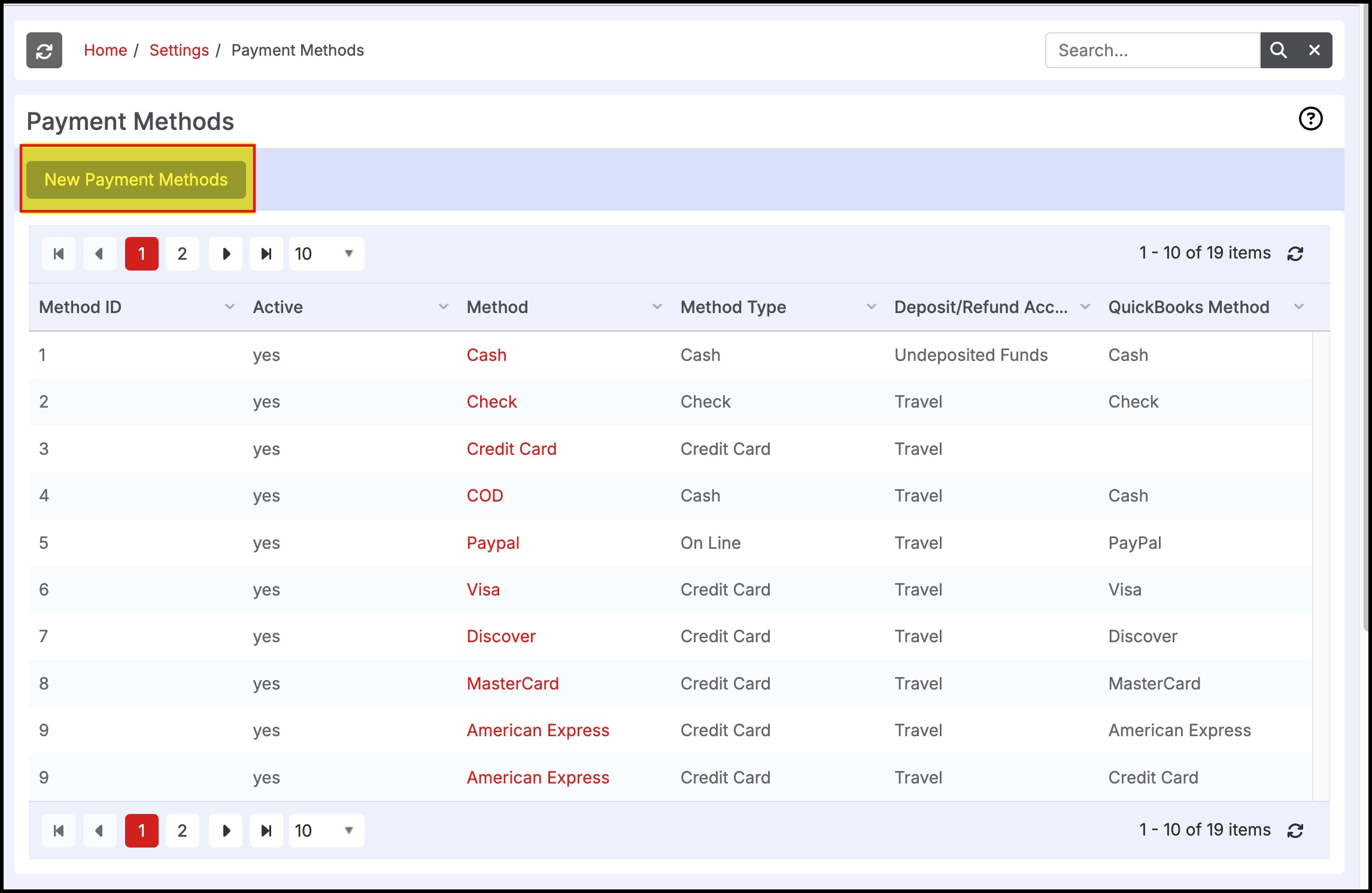 To create a new Payment Method, select "Settings > Payment Methods > New Payment Method" button.