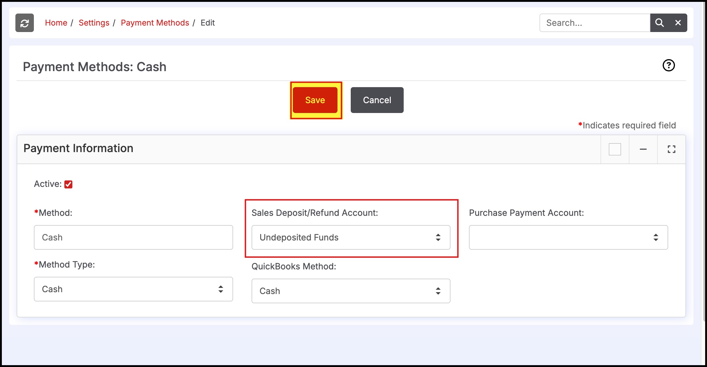 - QuickBooks Method: The corresponding QuickBooks Payment method to map for transactions exported to QuickBooks.