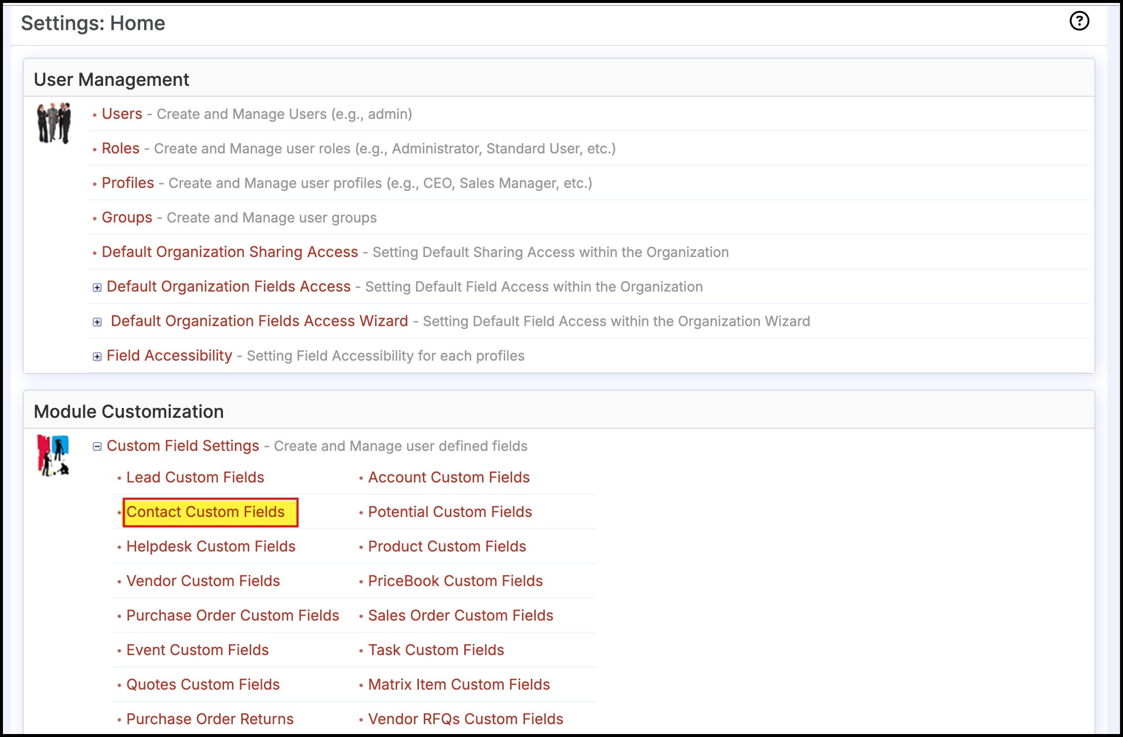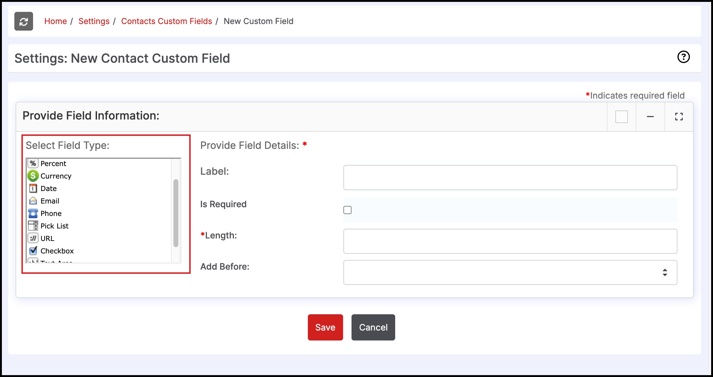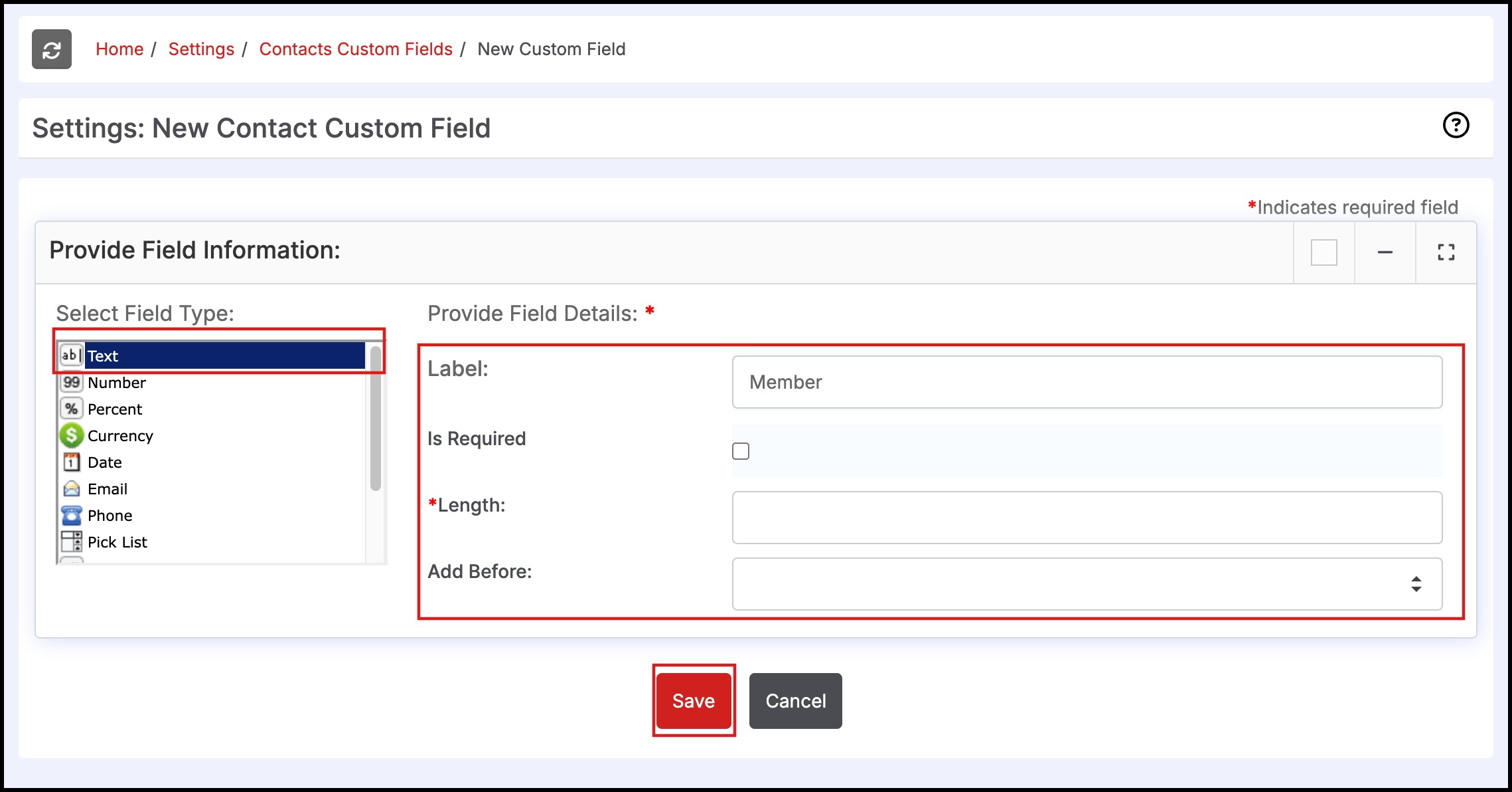 - Click "Save" to finish and add this custom field to the Contacts Module. Each time a contact is created, this field will now be available and information can be entered.