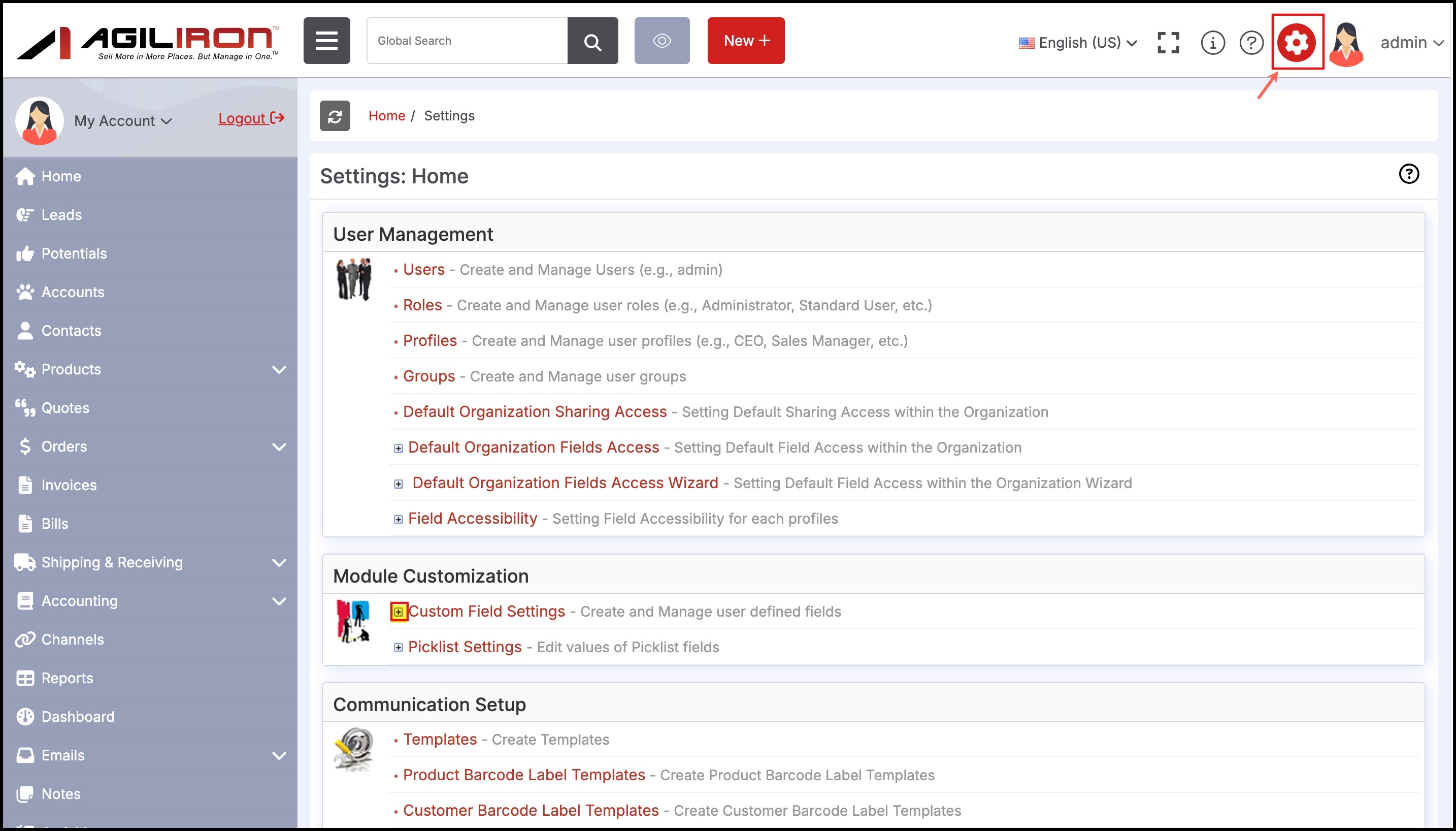 To create a custom field, follow the links to "Settings > Custom Field Settings > Click on the module of interest"