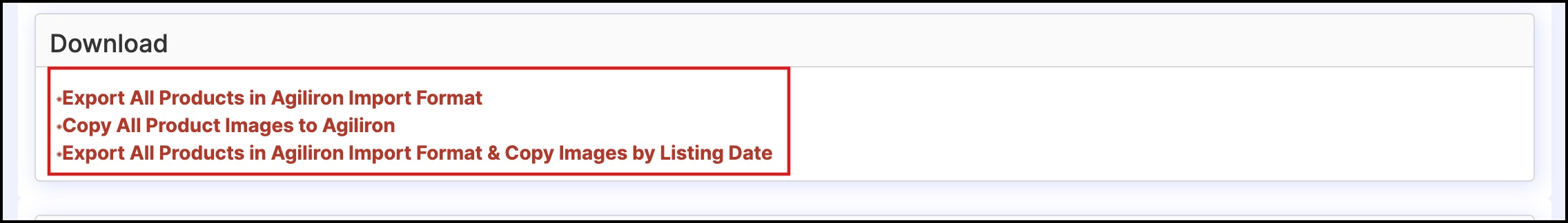 - You can also select the third download option to "Export All Products in Agiliron Import Format & Copy Images by Listing Date"
