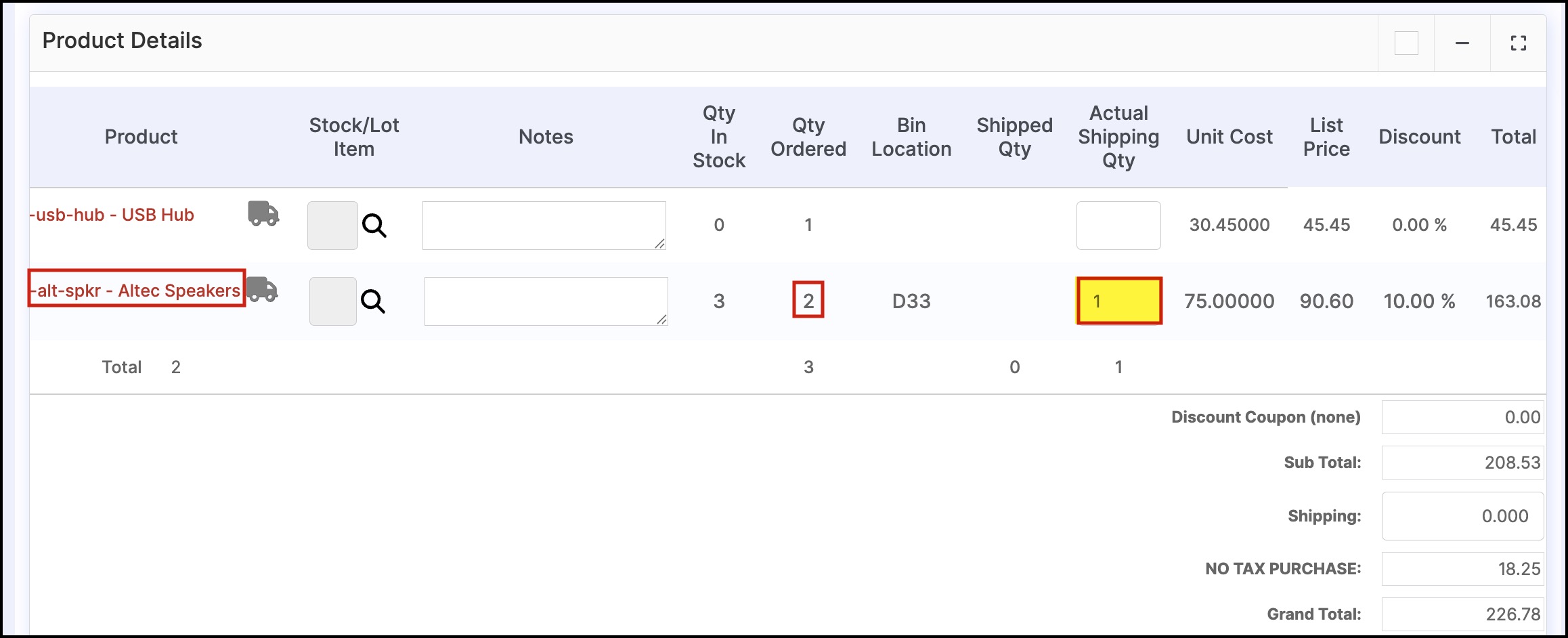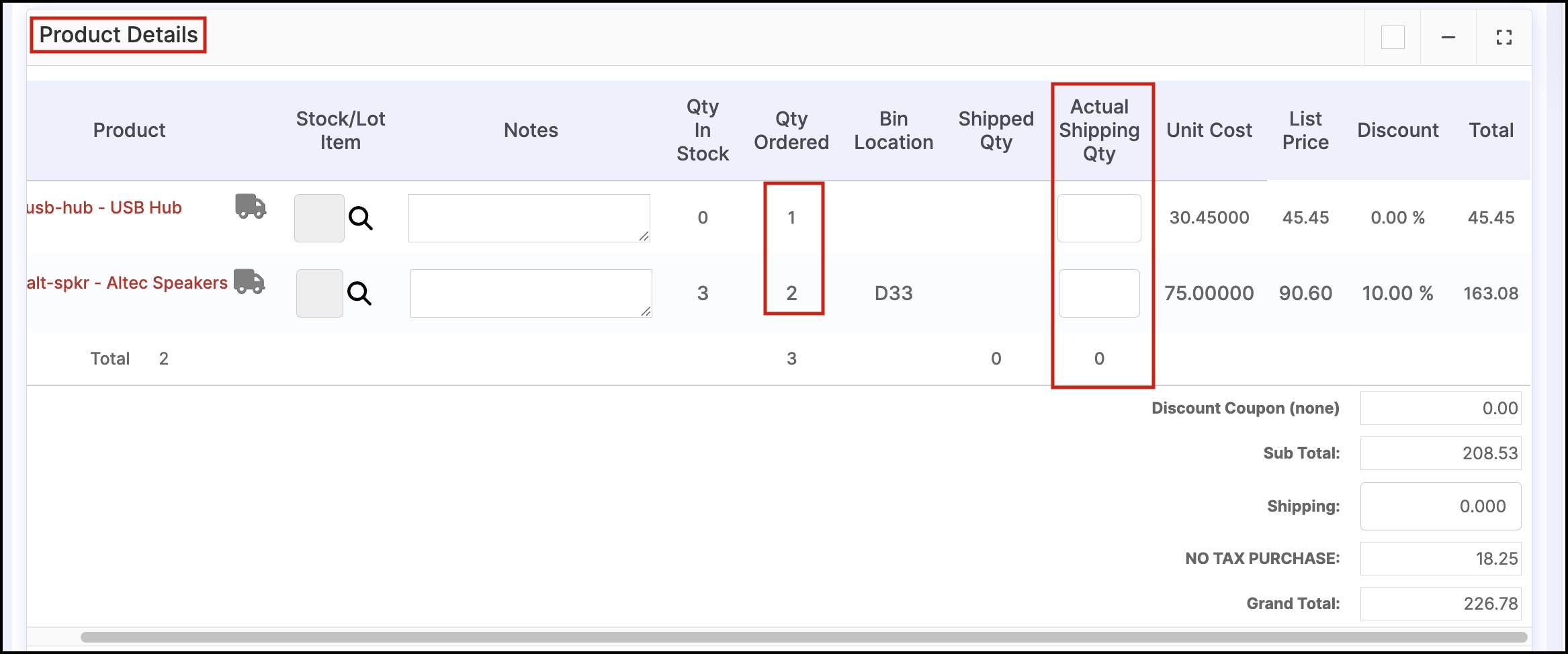 - Now, scroll down to Product Details section, where you can see 2 columns Qty Ordered and an additional Actual Shipping Qty (this appears only when the line item shipping is enabled)