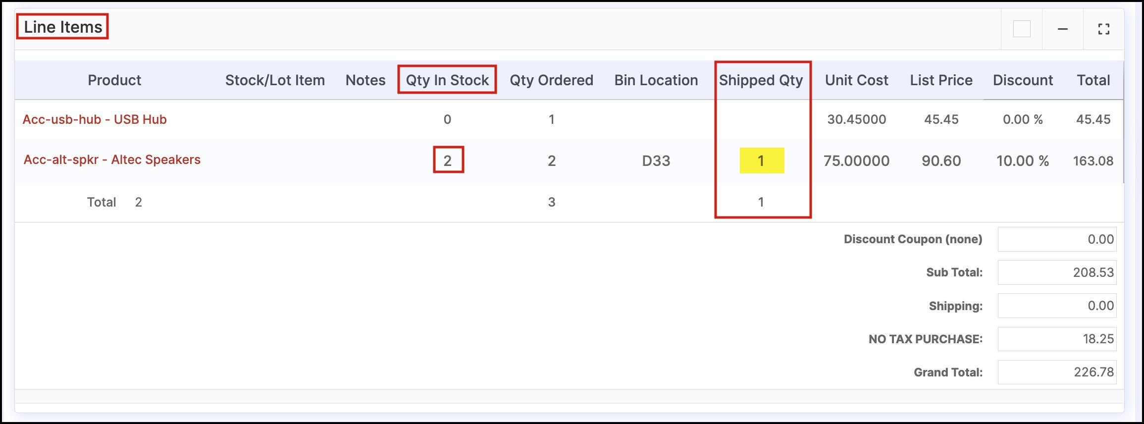 Now once you go back to the order, you can see in the Line Items section, the Shipped Qty changed to 1 and also the Qty in Stock has decreased by 1 (earlier it was 3, now it is 2)
