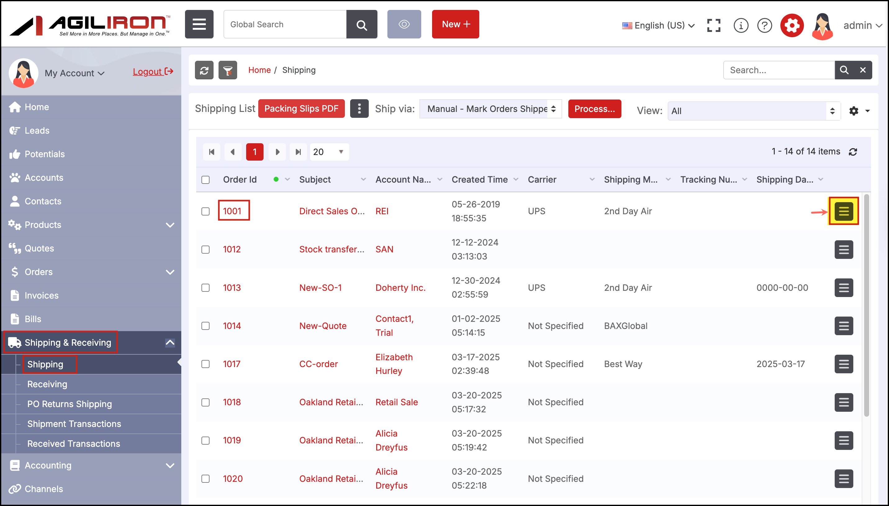 Go to Shipping & Receiving -> Shipping and click on the Edit icon of the order you want.