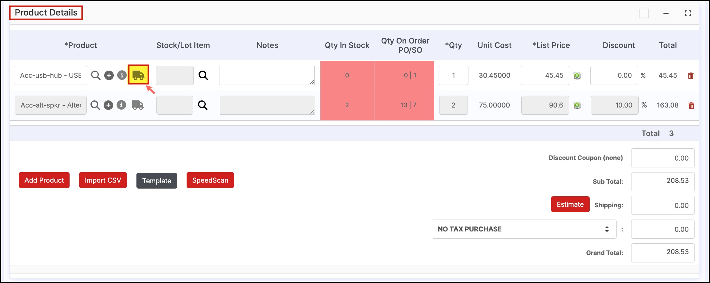 If the line item shipping is enabled, a truck icon will be visible, next to each line item.