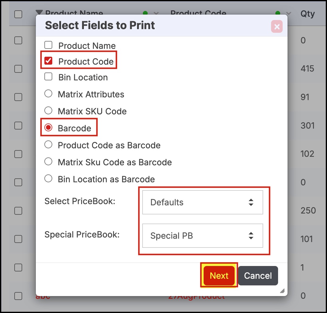 In case of standard workflow, an additional step for selecting fields to be printed and Pricebook will be included. Make a selection and click on Next.