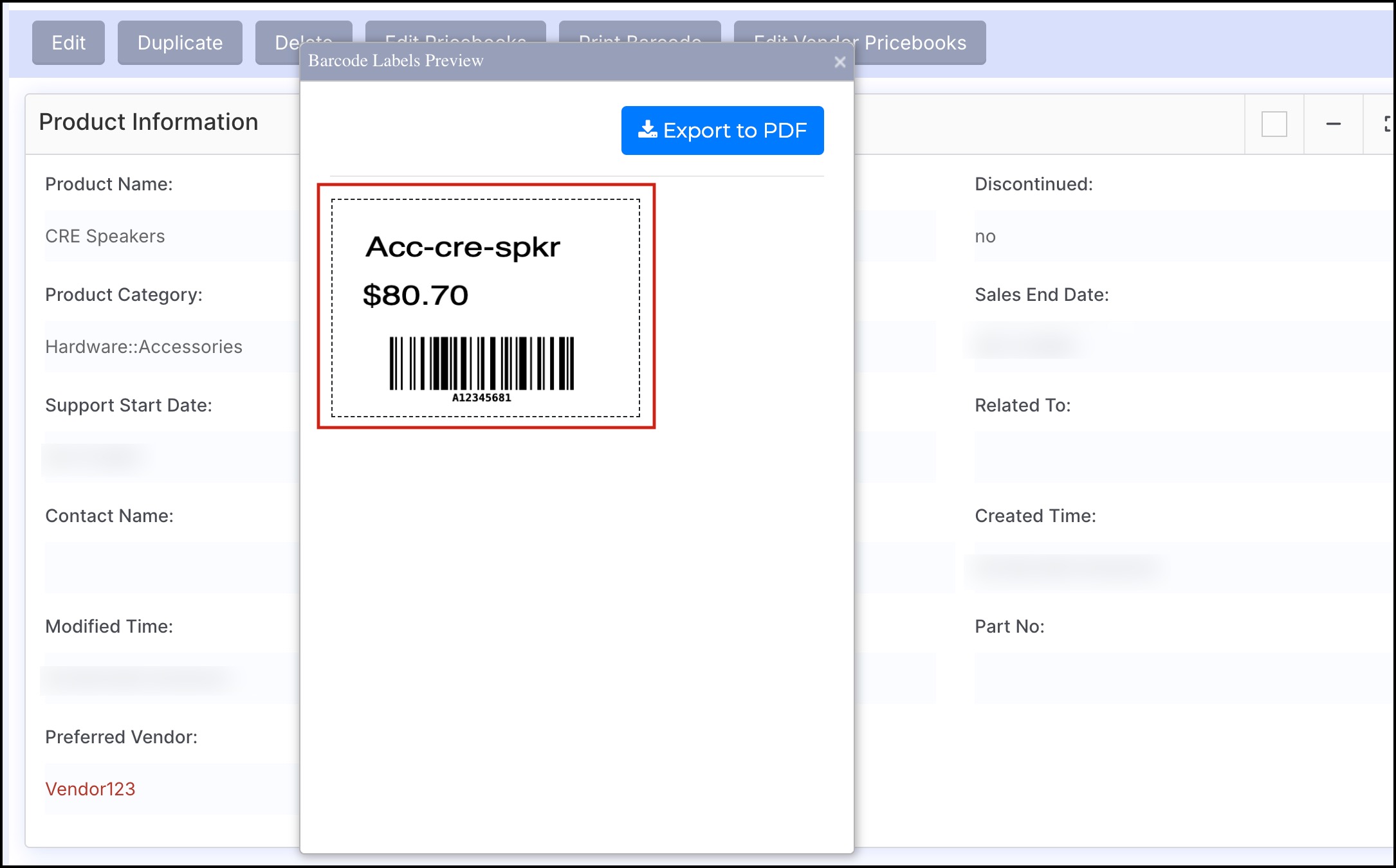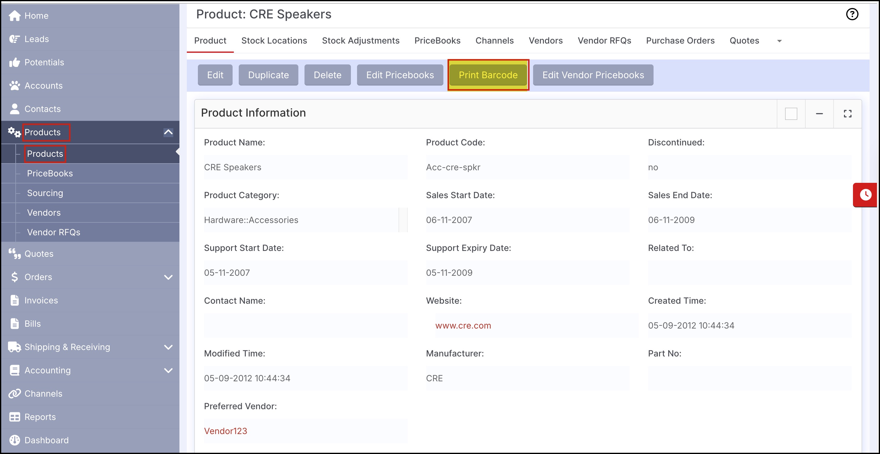 Print Barcode Option from Product Detailed View