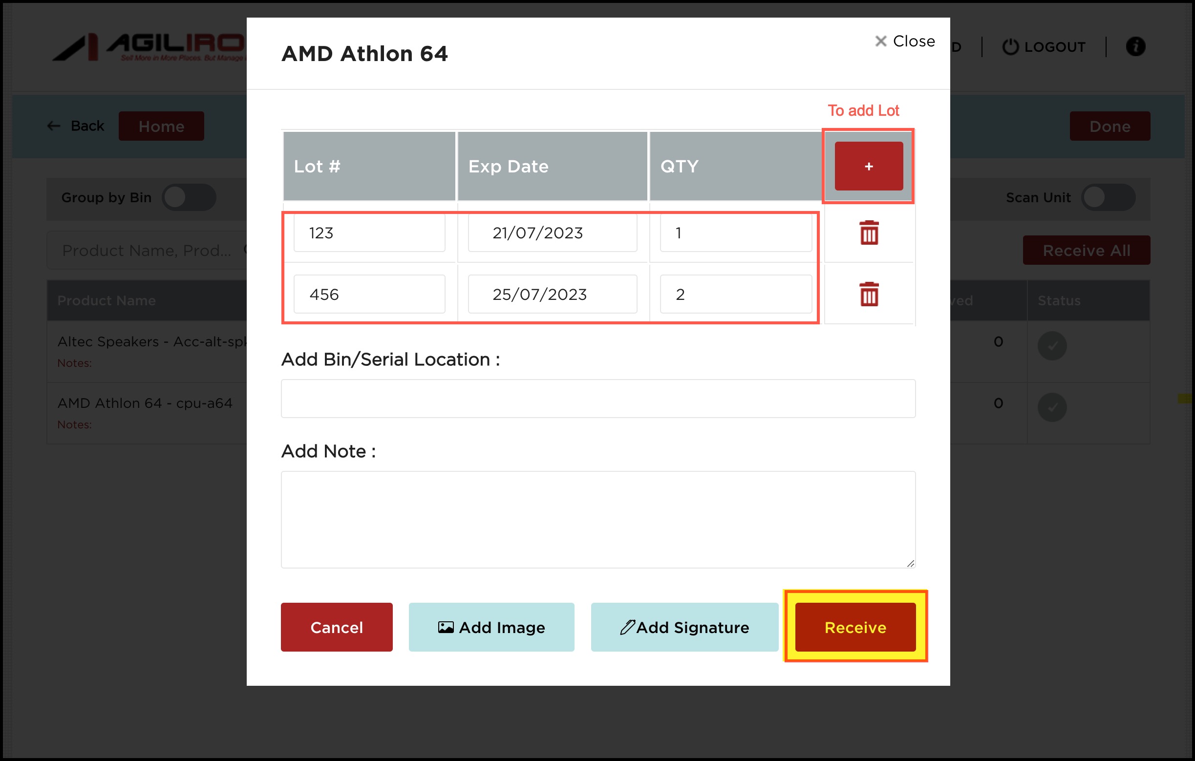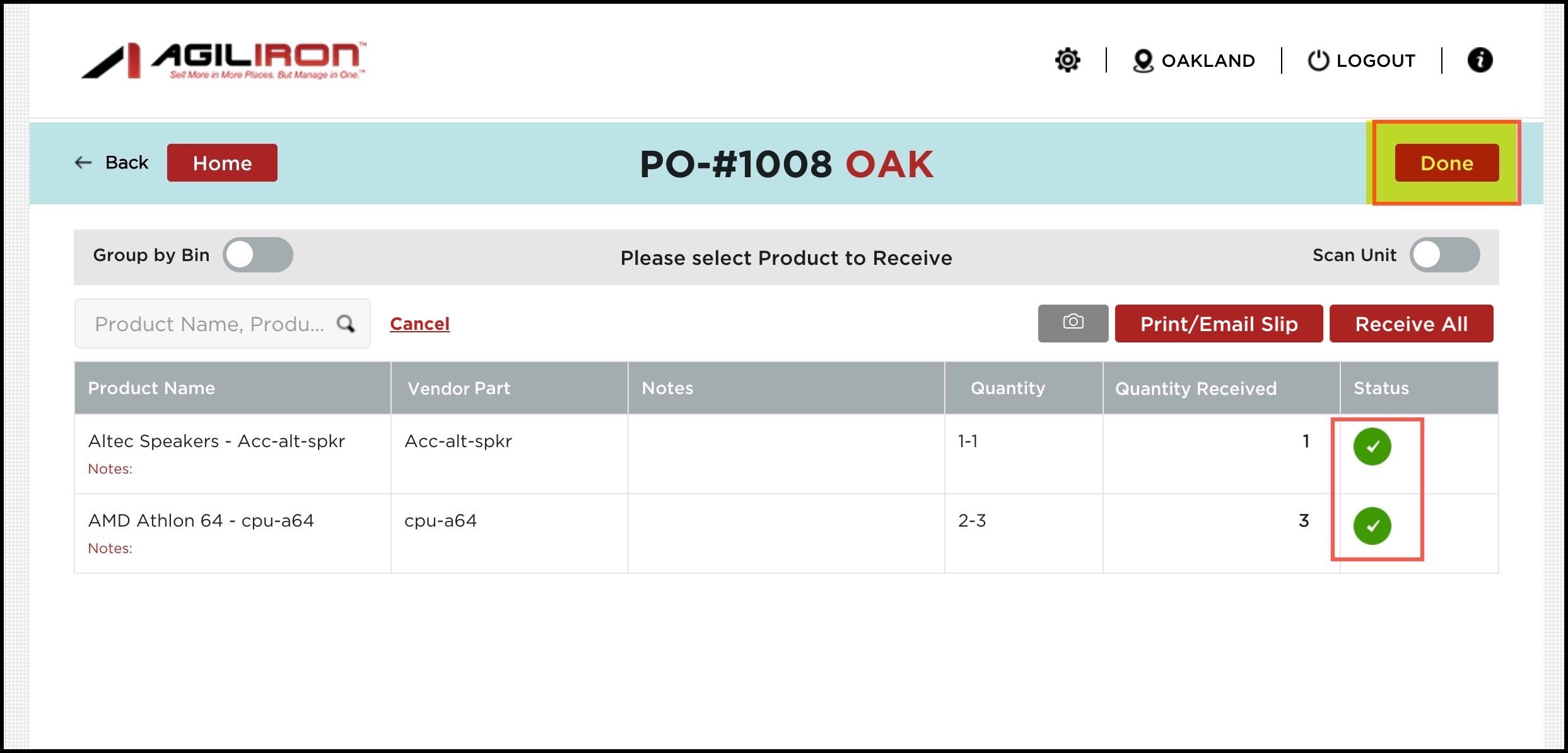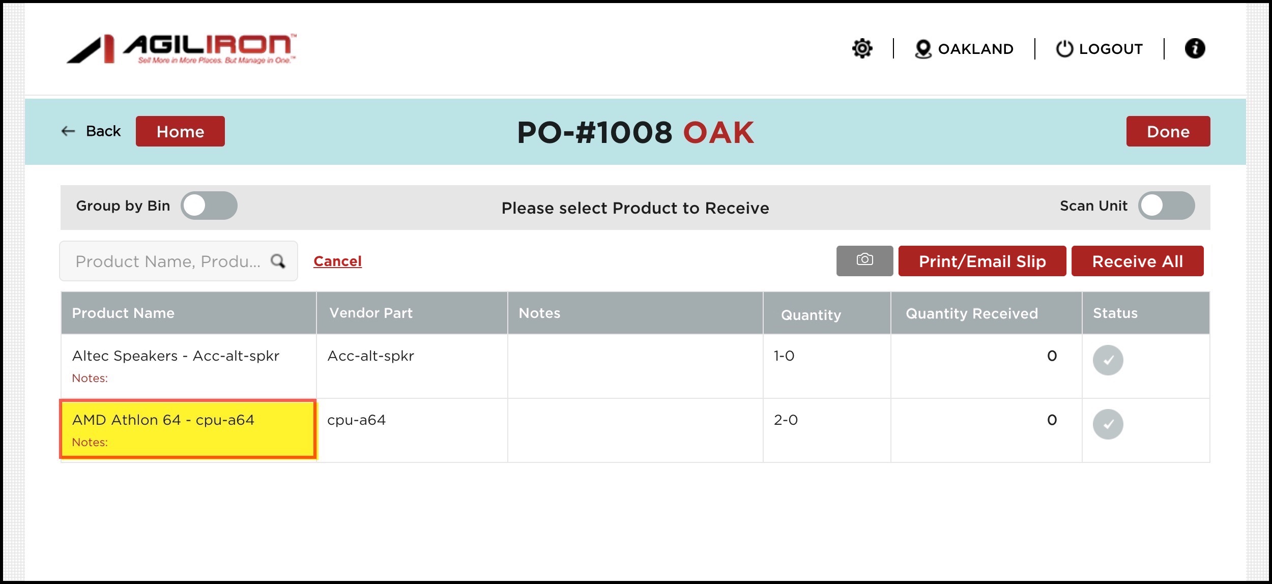Please note: The purchase order status will not update to "Received" in Agiliron until all items on the order have been received.