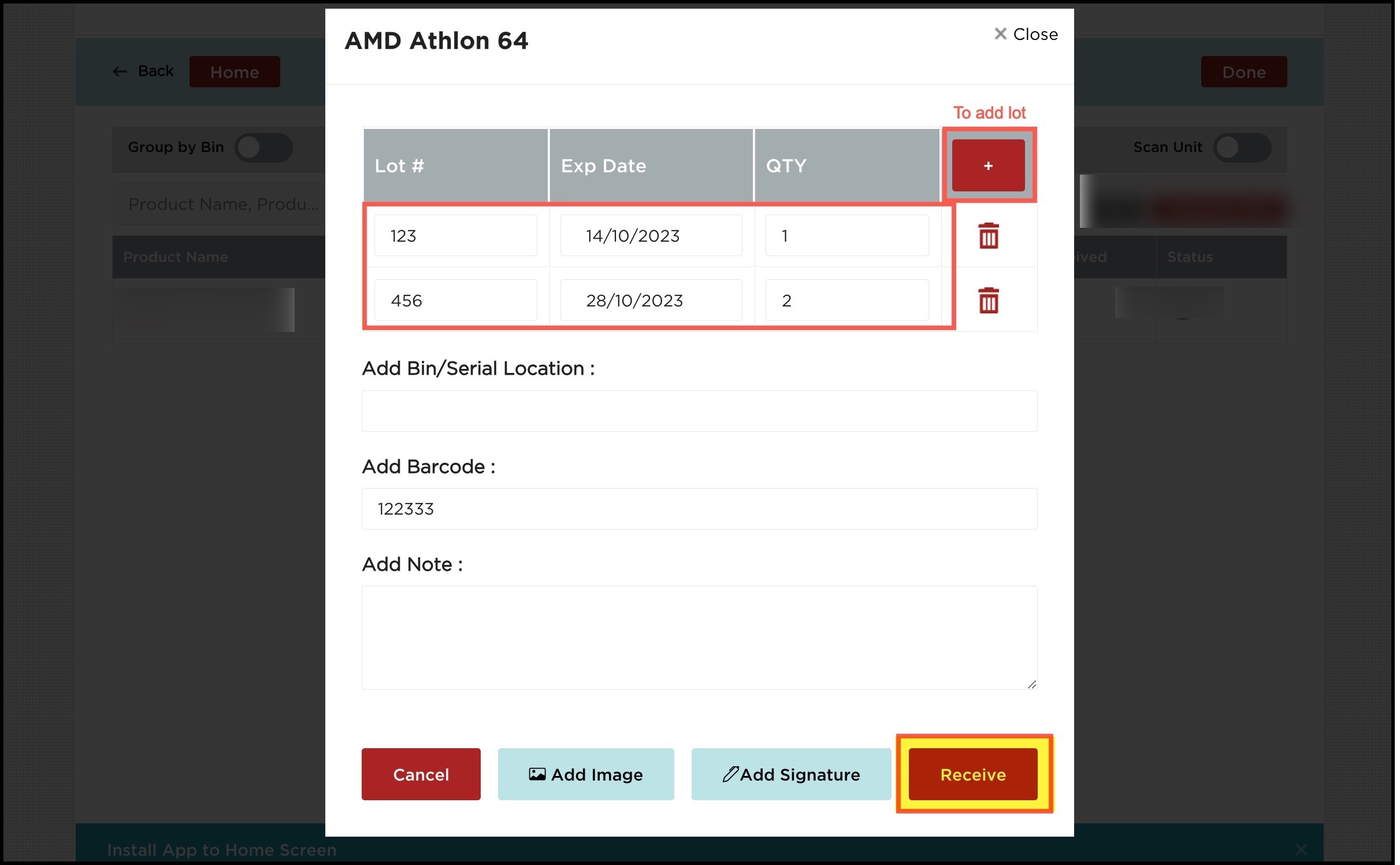 - Enter the Serial/Lot # for each quantity that will be received. (Scroll down to enter the information for each individual item).