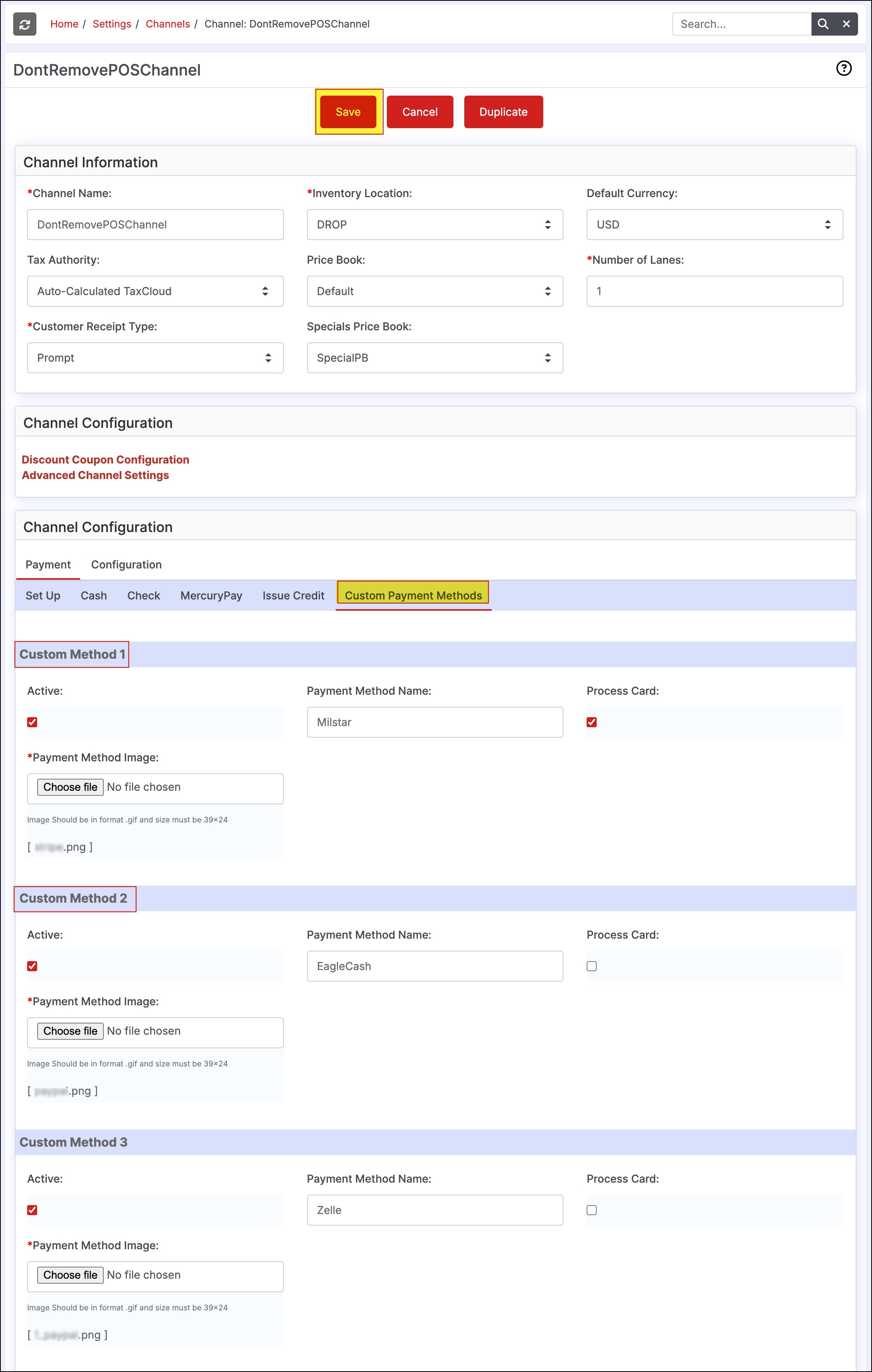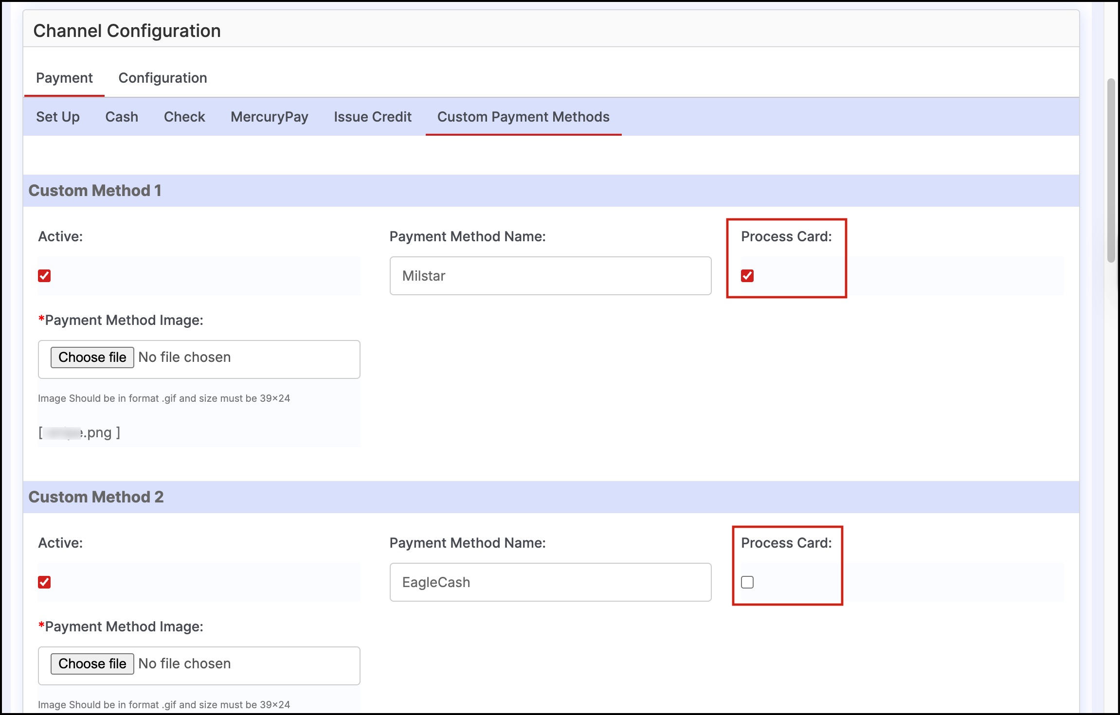 - If the Custom Method is setup as Card Processing (in BackOffice Channel Settings), then it will process the card for payment using the card processor setup.