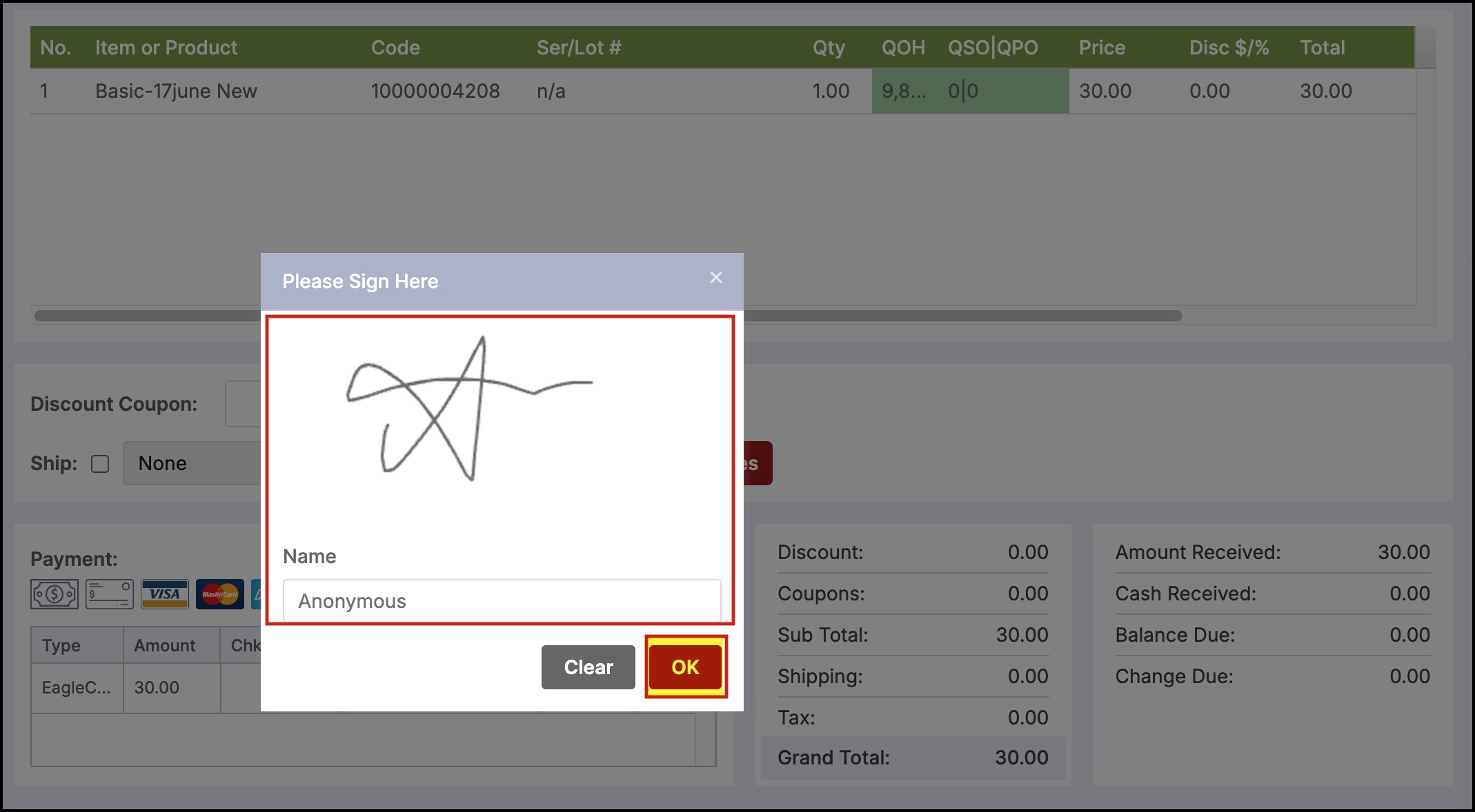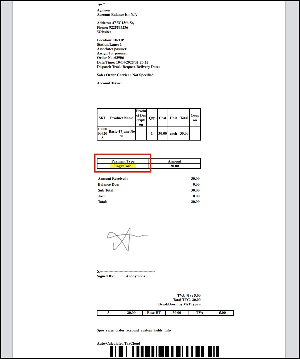 When you print receipt, you can see the Custom payment method name (EagleCash) displayed on the receipt.