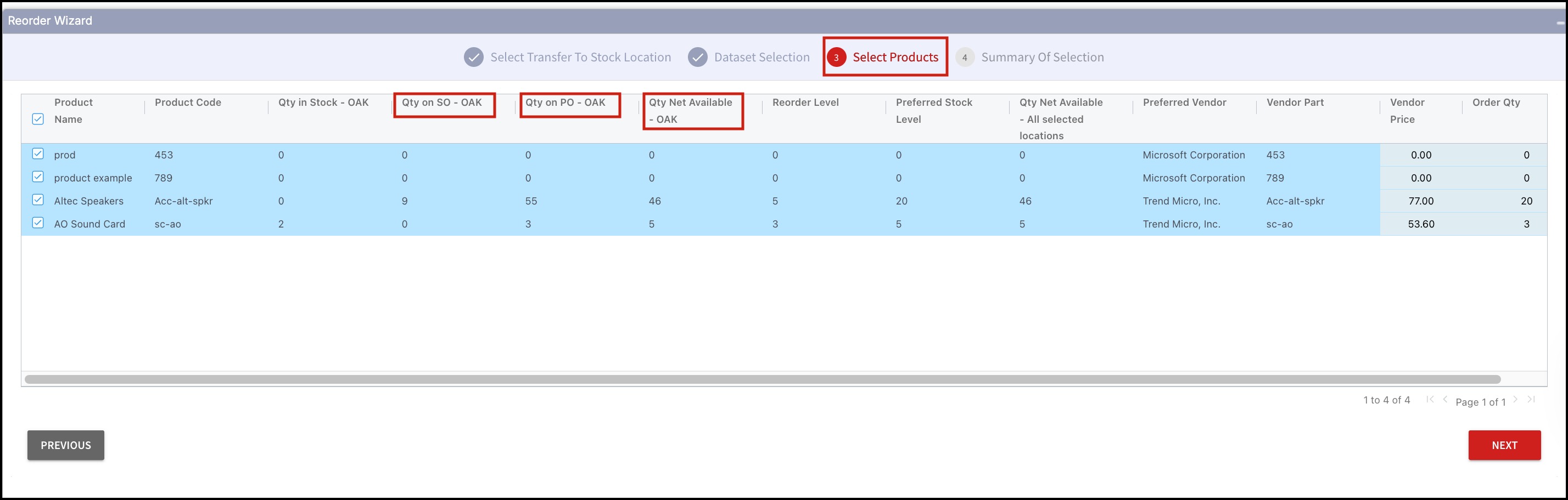 - Even in this flow, in the Select Products step, you can see Qty on SO and Qty on PO with Stock Location Code.